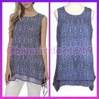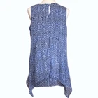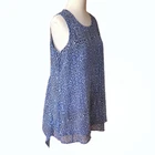 Fever Blue Mosaic Sleeveless Blouse Double Layer Flower Print •Size Medium •Pre-owned excellent condition •Double Sheer Layers •Shark bite hem towards hi-lo back •Care & Garment details tag has been removed (as pictured) •Backside has a pleated section, to give detail •Basic measurements provided in photo 💜 🐈 Cat friendly home 🚫 Smoke Free home