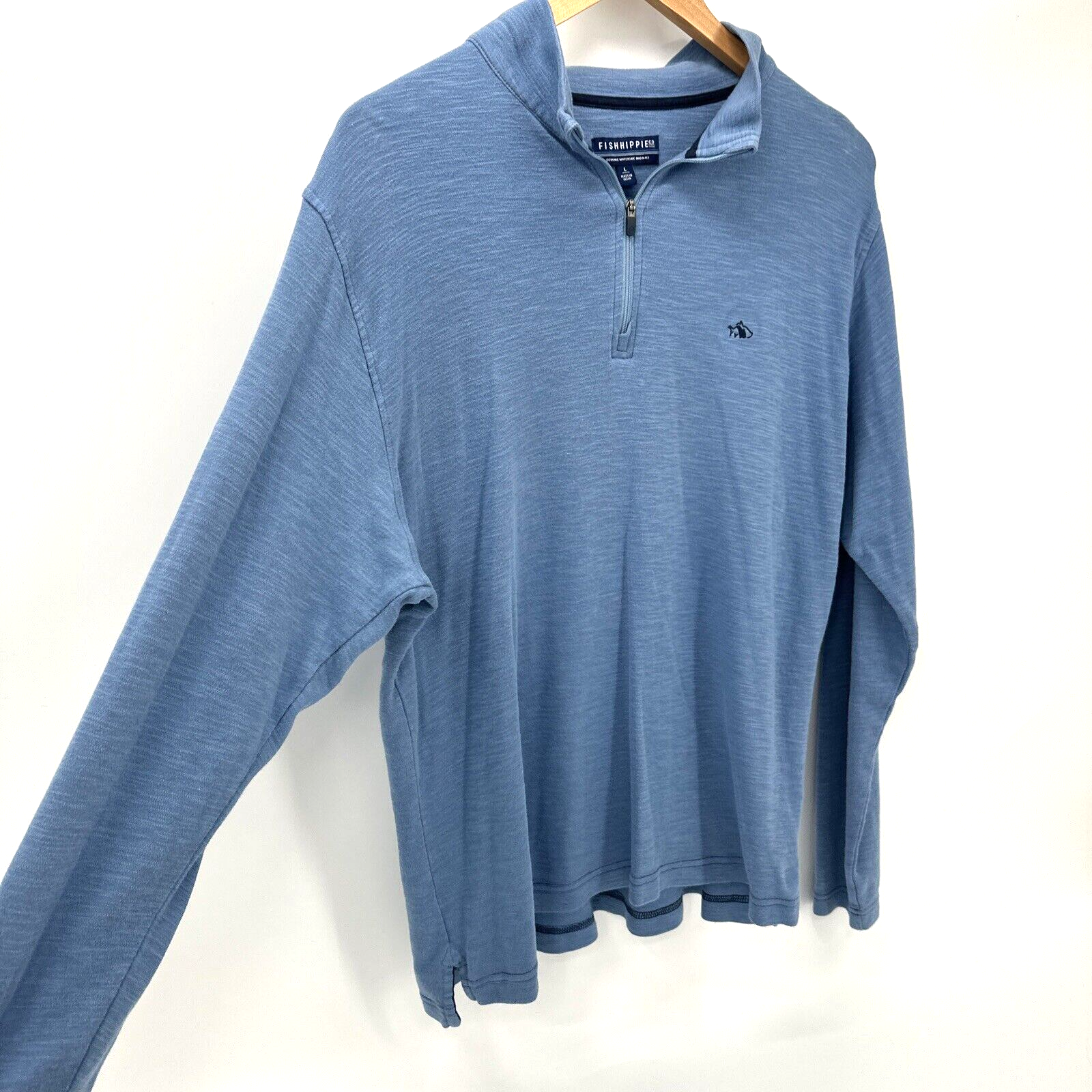 Fish Hippie 1/4 Zip Pullover Shirt Men's Large Blue Long Sleeves Mock Neck Cotton Modal Activewear Classic Very good condition, see all pictures for views. * Pit to pit: 24" * Shoulder to hem: 27" Ships out same day or next open postal day. Thank you for your purchase, we appreciate you!