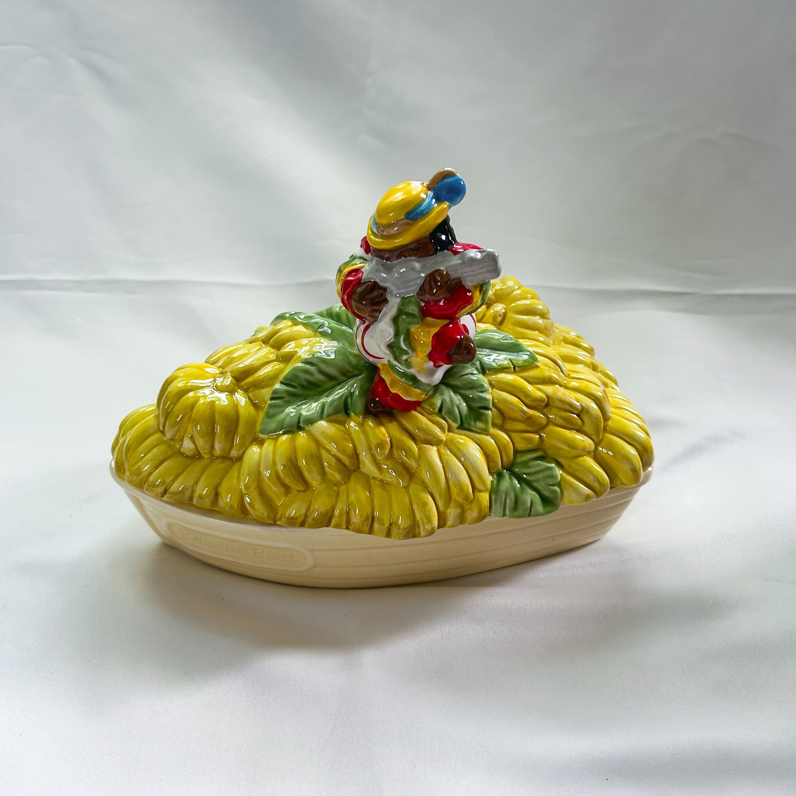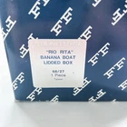 Fitz and Floyd Red Lacquer Rio Rita Banana Boat Covered Dish, Rare. This covered dish was made between 1989-1990. Handpainted. Made in Taiwan. Approximate dimensions: 6 1/4” tall, 7” long. New, in original open box. Item will be shipped in a recycled box.