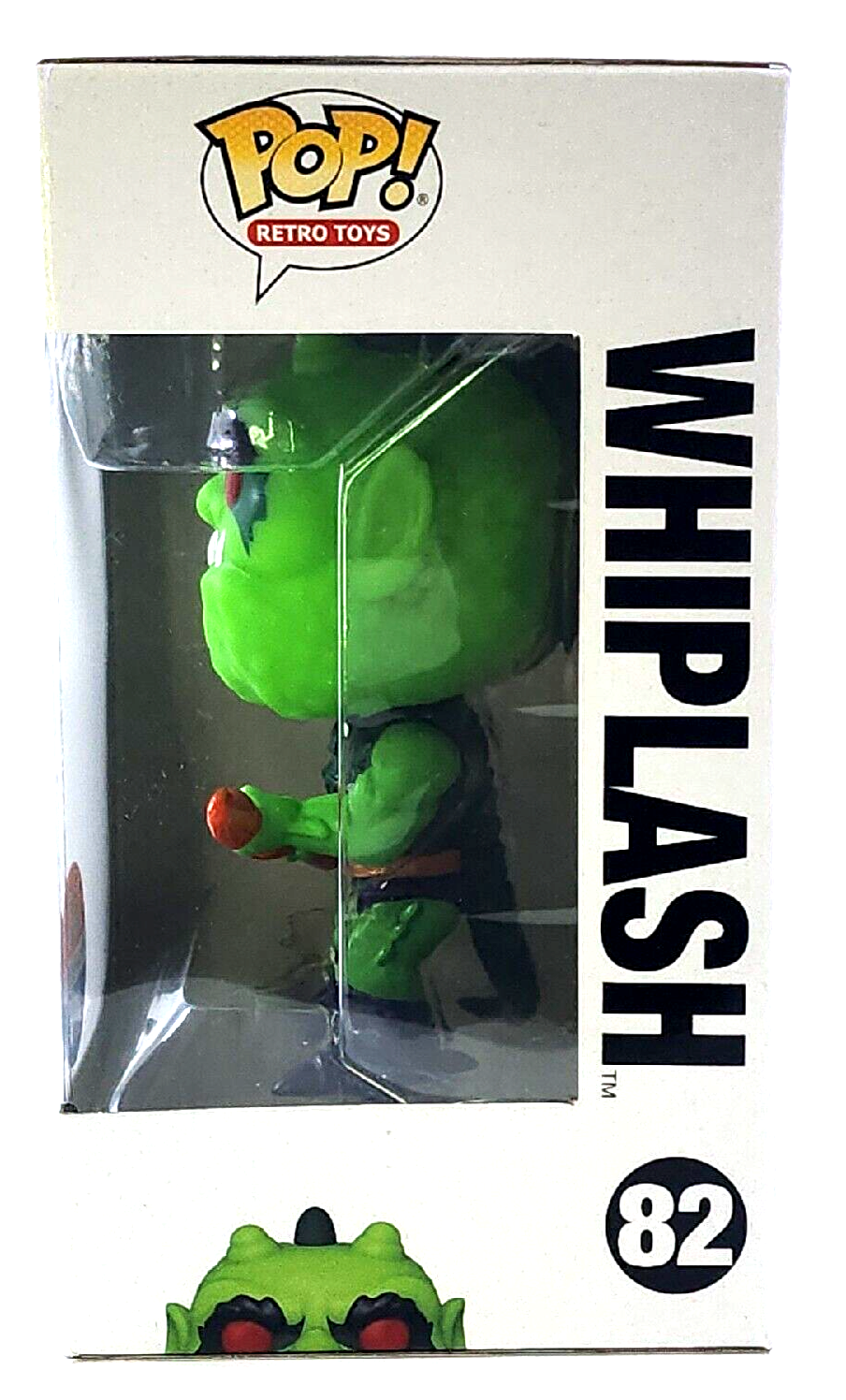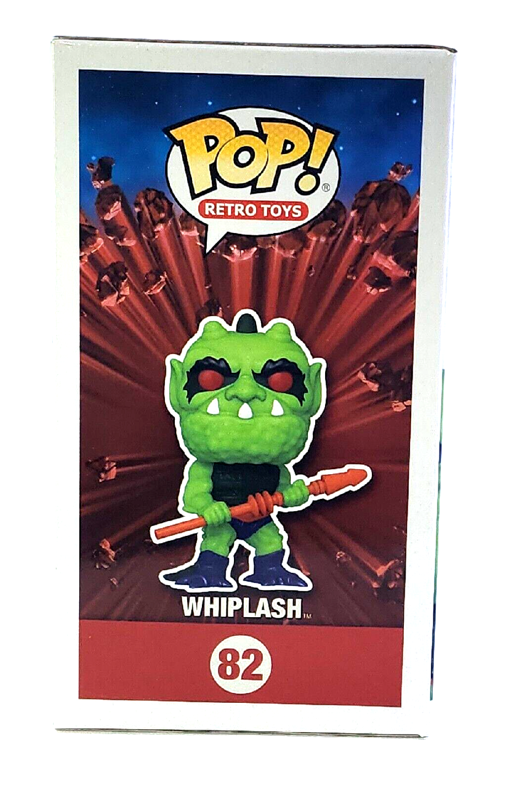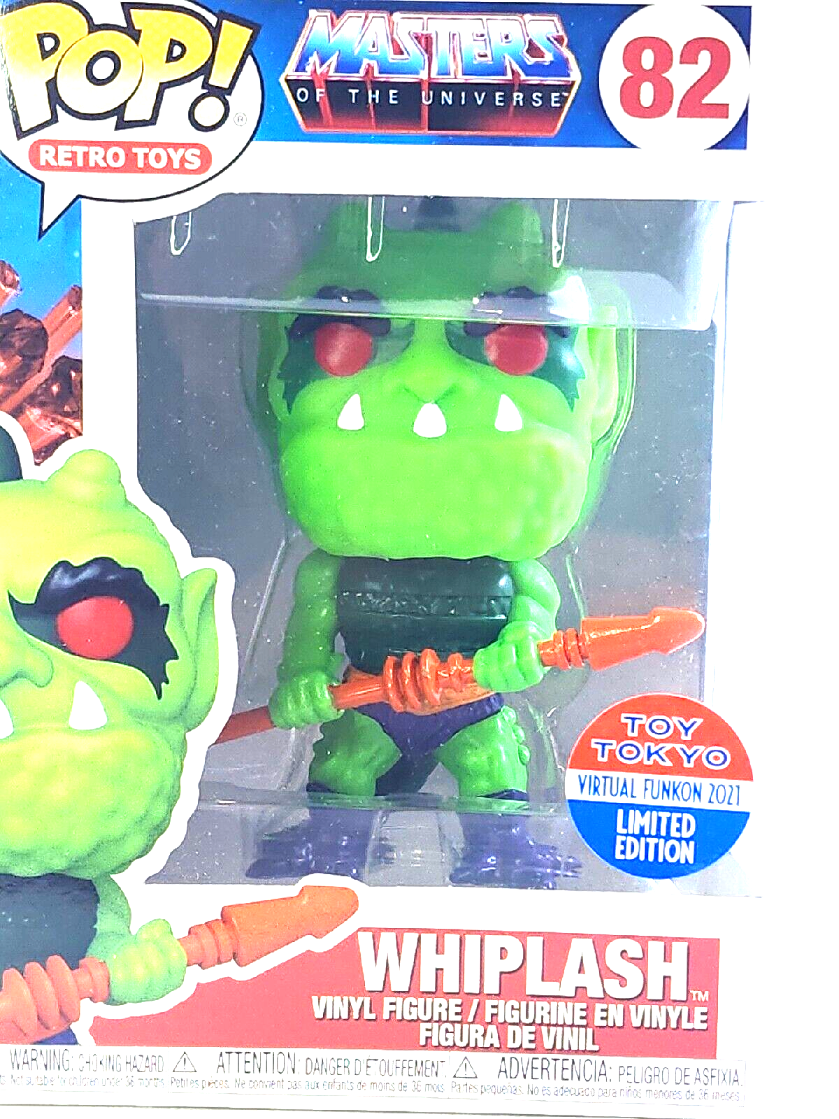 Funko Pop! Vinyl Figure of Whiplash from the Masters of the Universe franchise. This exclusive item was released in 2021 for the virtual Funkon event and features a vaulted design. The figure stands at 4 inches tall and comes in its original unopened packaging. It is part of the Retro Toys collection and has a box number of 82. The product is an SDCC Toy Tokyo exclusive and is made of vinyl material. It is recommended for ages 3 and up. Loc.S1