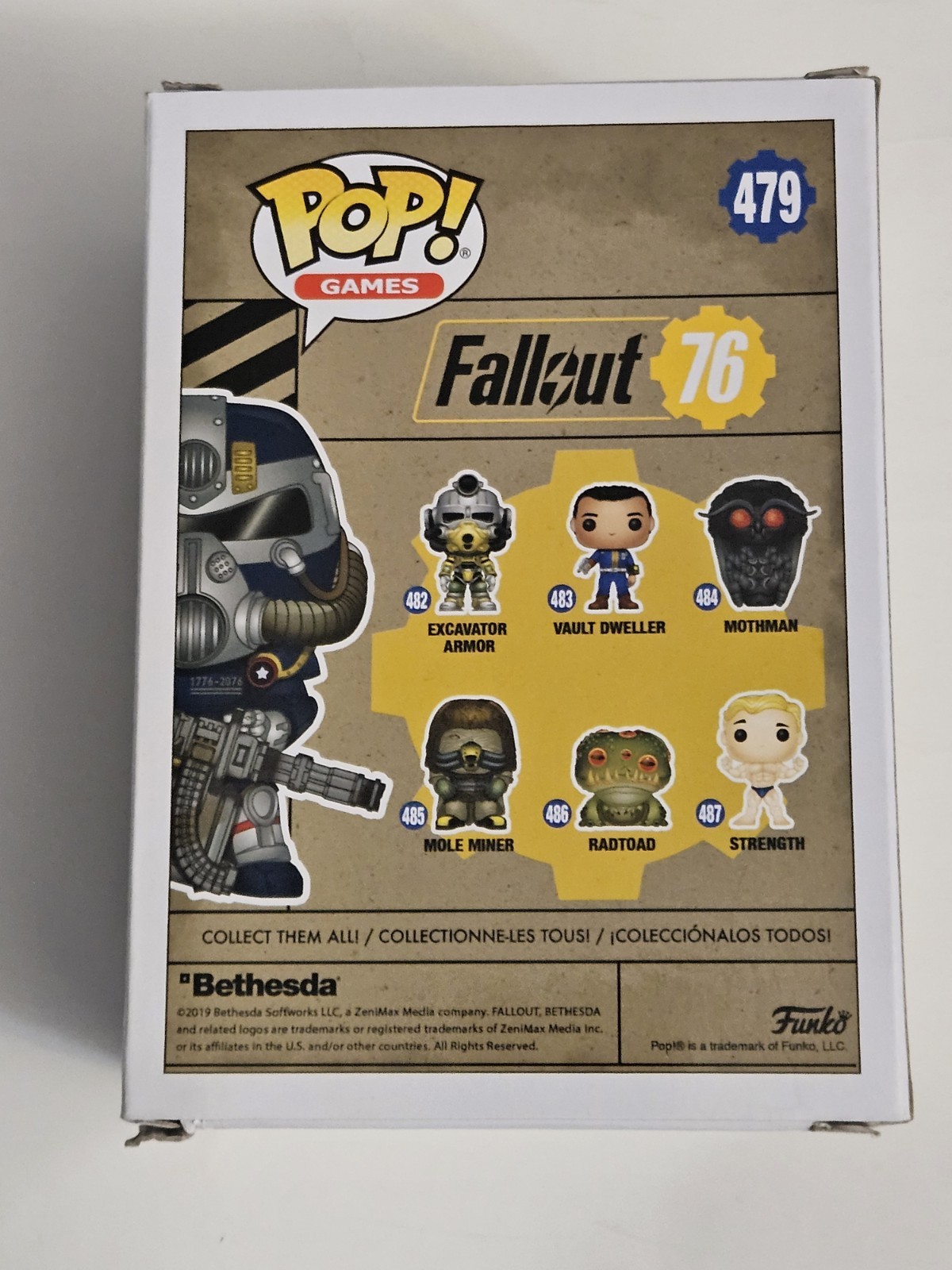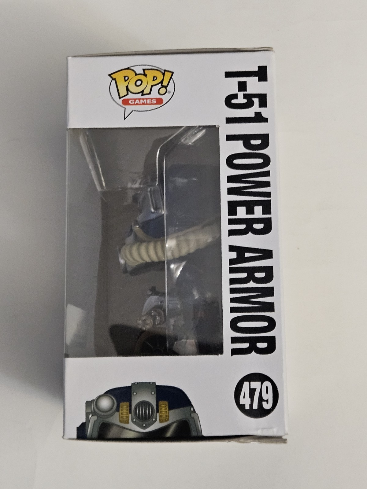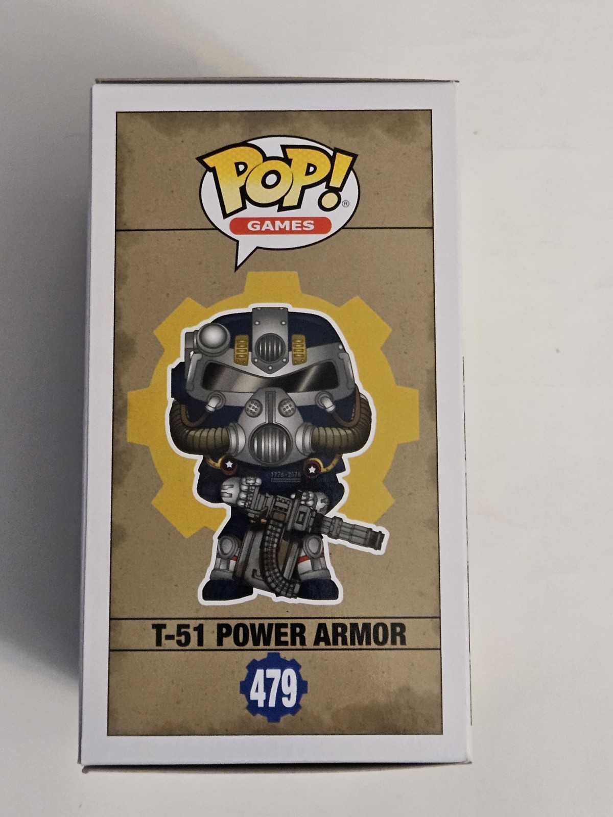 The Funko POP! Games Fallout 76 #479 T-51 Power Armor Walmart Exclusive Vaulted is a vinyl figure collectible from the Fallout franchise. This standard-sized figure features the T-51 Power Armor character in tan, blue, gold, and silver colors. Released in 2019, this exclusive Walmart edition is part of the Pop! Vinyl collection by Funko. The box number is 479 and the figure is vaulted, indicating its exclusivity and rarity among collectors. Perfect for fans of video games and the Fallout series, this collectible is a must-have for any enthusiast of the genre. DAMAGED-Bottom Corner and Top Corner.