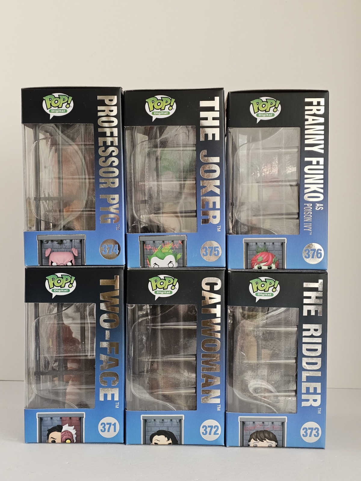 This super combo of 6 Funko Pop! Digital Batman Villains Series 2 is a dream come true for any Batman fan. It includes: 1. *Two-Face Batman #371* (limited edition of 5000 units) - The iconic villain with a split personality, now in digital format 2. *Catwoman #372* (limited edition of 1900 units) - Gotham's sexy and cunning cat burglar, ready to cause trouble 3. *The Riddler #373* (limited edition of 1900 units) - The criminal mastermind with a love for riddles, now in your collection 4. *Professor Pyg #374* (limited edition of 1900 units) - The disturbing villain with a touch of madness, now digital 5. *The Joker (Batman: The Animated Series) #375* (limited edition of 999 units) - The clown prince of crime in his classic animated version 6. *Franny Funko as Poison Ivy #376* (limited edition of 2300 units) - The seductive and deadly botanist, portrayed by Franny Funko herself Don't miss this opportunity to complete your collection of Batman villains! 🚀