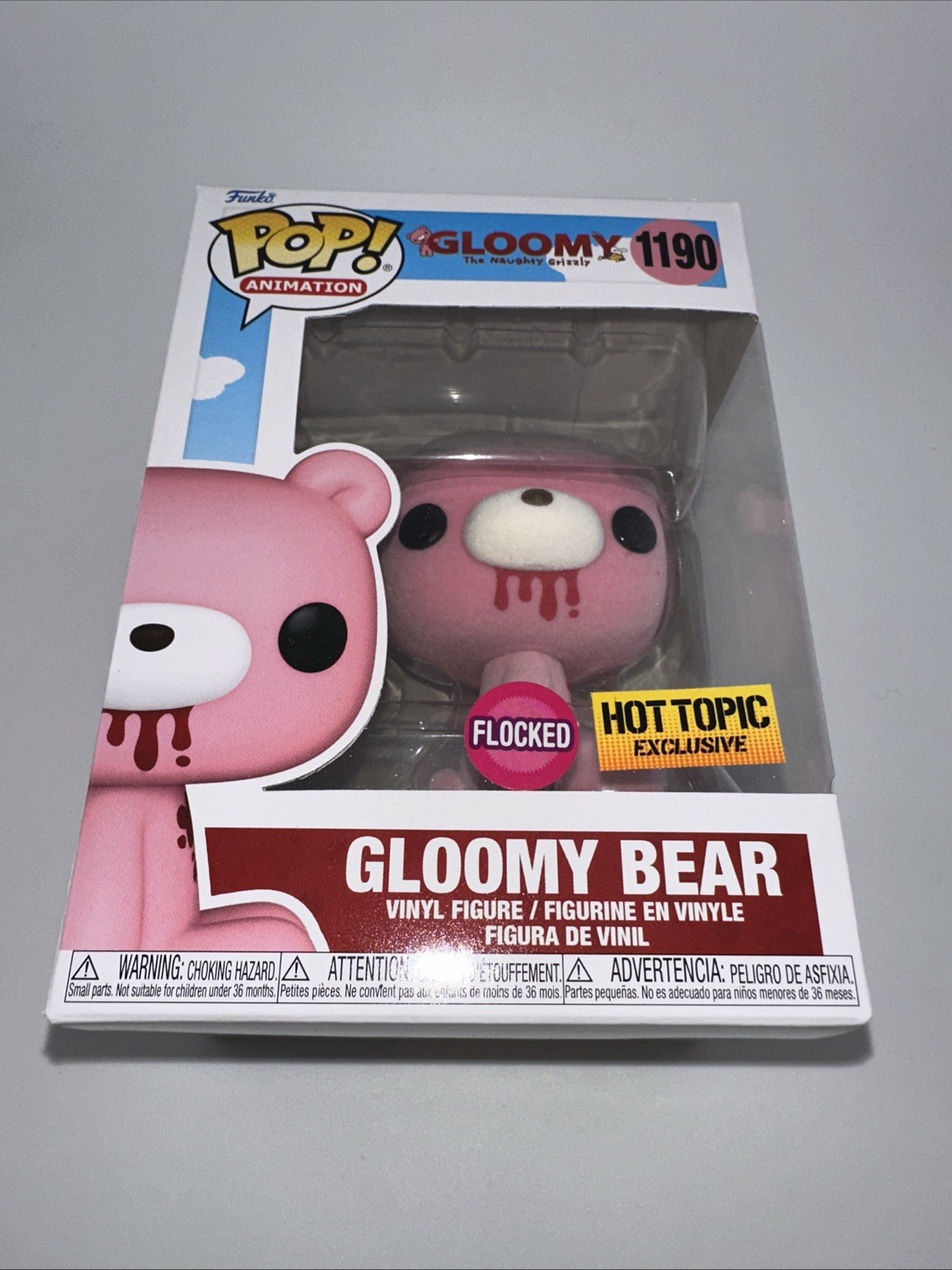 The Funko Pop! Flocked Gloomy Bear is a Hot Topic exclusive collectible figure from the Anime series featuring the character Gloomy Bear. This vinyl figure comes in its original packaging, with a flocked finish and includes a protector. With its vaulted status, exclusive release, and unique features, this collectible is a sought-after addition for fans of the franchise and collectors of Funko Pop! figures. One small spot of wear on the top of the box. Please see all photos for product condition.