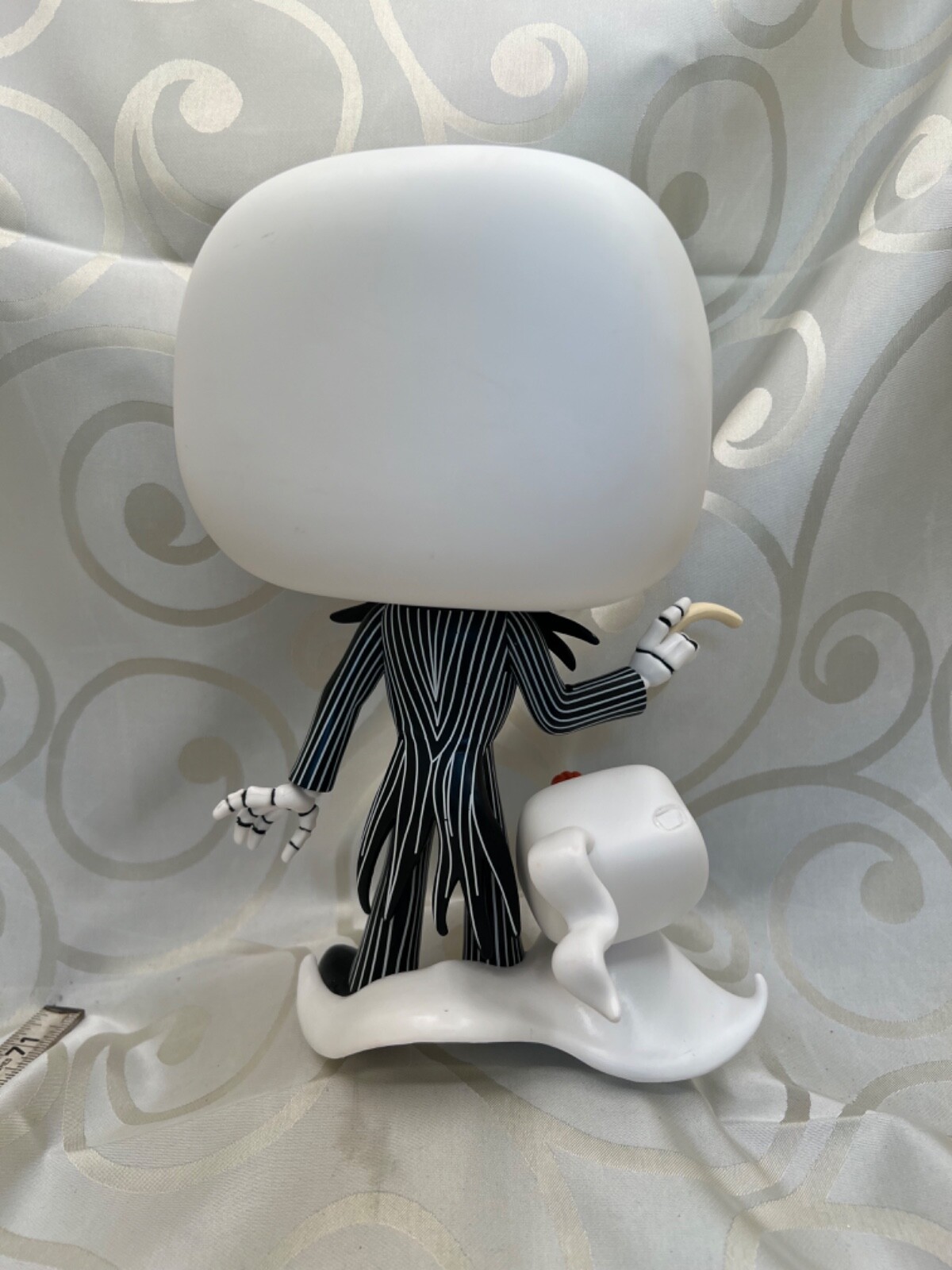 This Funko Pop figure features Jack Skellington standing at 10 inches tall, accompanied by Zero. Jack is a character from "The Nightmare Before Christmas" movie by Disney. The figure is made of ABS plastic in multicolor, part of the Disney franchise collection. It was released in 2022 as an exclusive item from Funko. The figure is of Jack Skellington, a featured character, and does not come in its original packaging.