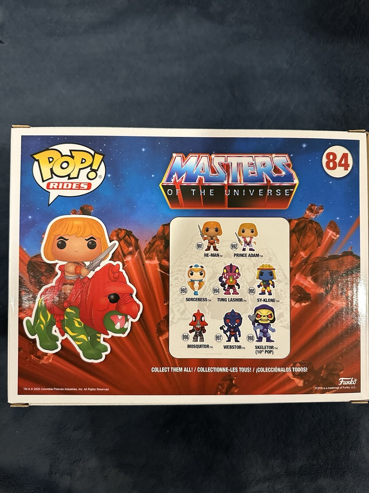 The Funko Pop! Rides: Masters of the Universe - He-Man on Battle Cat #84 is a vinyl figure from the Masters of the Universe Series 5. This exclusive collectible features He-Man riding on Battle Cat, capturing the iconic duo from the popular Masters of the Universe TV show and retro toy line. The product is a part of the Pop! Rides collection by Funko, with original unopened packaging, making it a sought-after item for fans of the franchise.