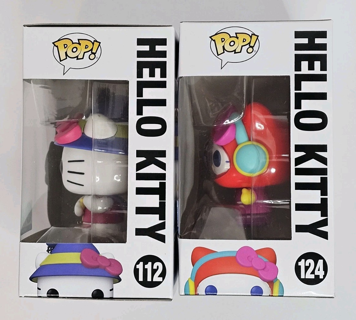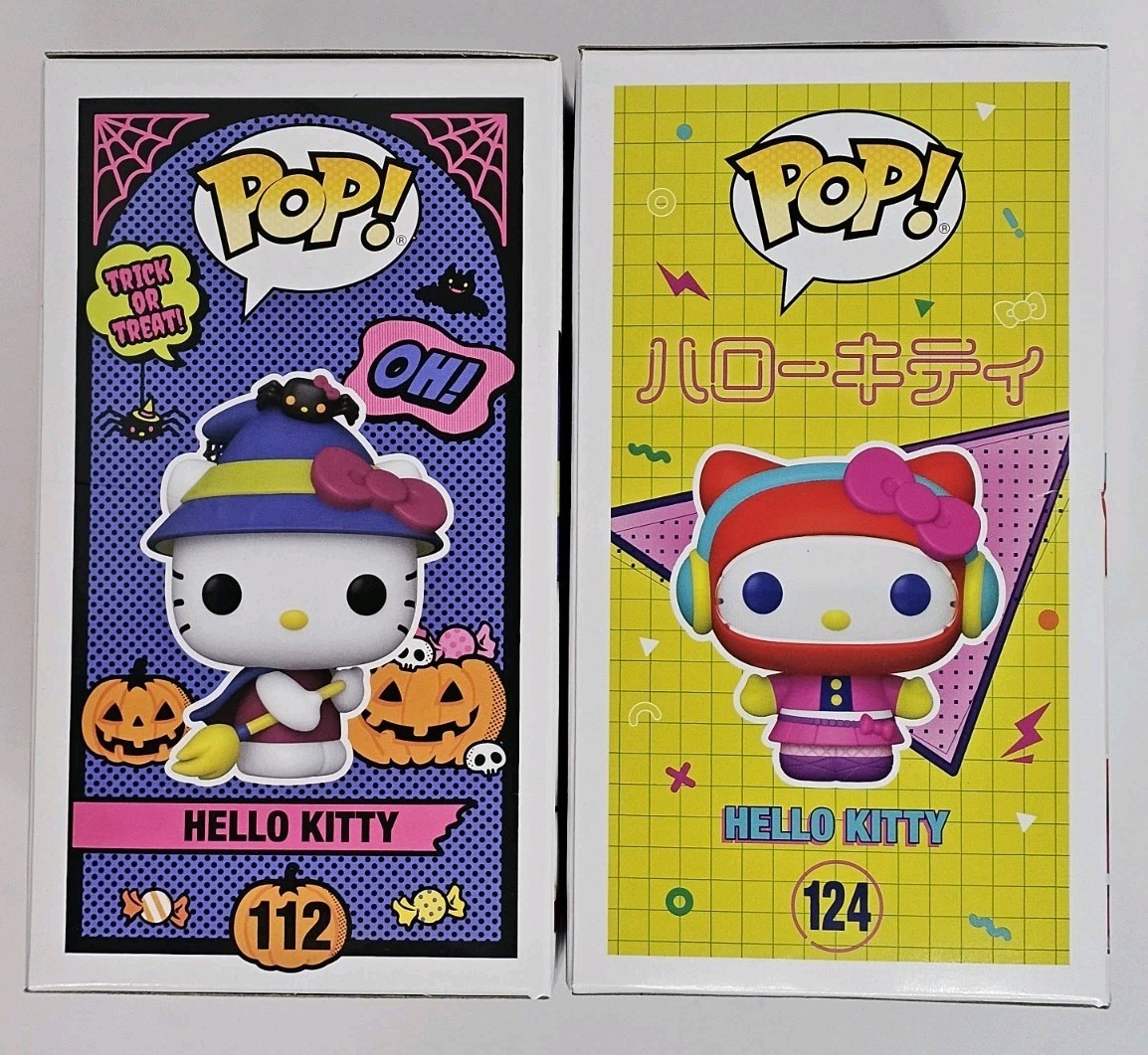 The product is a set of two Funko Pop figures from the Sanrio Hello Kitty franchise, specifically the Halloween-themed Hello Kitty figures 112 and 124. These multicolor vinyl figures come in their original packaging with a protector and a wall shelf for display. The figures are part of the Pop! Vinyl collection and are exclusive to Funko. The Hello Kitty figures are standard size and are based on the 20th anniversary of the Hello Kitty character, making them a must-have for Sanrio and Hello Kitty fans.