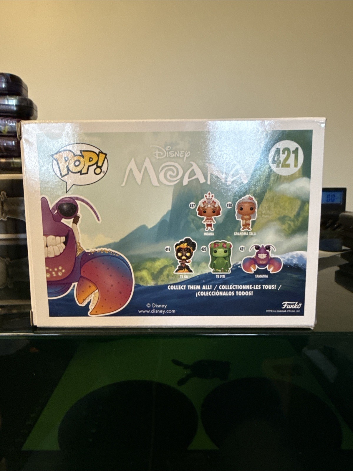 The product is a Funko Pop Tamatoa Glitter #421 Crab Figure from the Disney Moana movie. This vinyl figure is part of the Moana Series 2 collection and features the character Tamatoa in a multicolor design with glitter accents. It comes in its original packaging from 2018, making it a collectible item for fans of Disney and animation. The figure is a standard size and comes with a protector for preservation. This Pop! Vinyl product is a must-have for collectors of Disney-themed figurines.