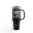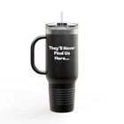 This unique and humorous 40oz insulated travel mug features an original design showcasing Bigfoot and an alien enjoying a drink together at a bar, with the witty caption "They'll Never Find Us Here" printed below. Features: High-Quality Construction: Made from durable stainless steel with a double-wall vacuum insulation to keep your beverages hot or cold for hours. Large Capacity: 40oz capacity is perfect for long trips, work, or outdoor adventures. Leak-Proof Design: Securely fitting lid with a flip-top opening for easy drinking. Eye-Catching Design: Unique and humorous artwork that's sure to be a conversation starter. Perfect Gift: A fun and practical gift for any fan of Bigfoot, aliens, or quirky humor.