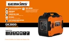 ⚡ Delivers astonishing true 3300 watt consistent power(3800 peak watt) by GENKINS industrial class 163cc engine ⚡ 2.11 Gal Gas Tank 8 hours run time on ECO mode ⚡ 57 dB when on ECO mode! RV & Camper friendly ⚡ At only 58 lbs, can be carried around by any grown adults, no lifting tool required ⚡ Auto shut down when low on oil, built in fuel gauge to help you manage your gas level ⚡Parallel ready with any GENKINS generators ⚡2 years limited warranty! + life time free tech support! We have you covered in cause it you encounter technical issues The ultimate camping generator, introduction Genkins GK3800i, a portable inverter generator delivers an astonishing 3300 watt consistent power on the go! Carry enough juice to power all your RV equipment while keep things quiet The ultimate camping generator, introduction Genkins GK3800i, a portable inverter generator delivers an astonishing 3300 watt consistent power on the go! Carry enough juice to power all your RV equipment while keep things quiet! Detailed Spec: Rated Voltage & Frequency: 120V/60HZ Running VAC Amperage: 27.5A Rated Output: 3300Watt Max. Output: 3800 watt Enigine Brand: GENKINS GK160Vi Engine Type: OHV, 4-stroke Engine Displacement1: 63cc Bore X Stroke: 62×54 Engine RPM 4000 rpm AC Load:100% Phase: Single Recommended Oil: SAE15W-40 Lubrication Method Splash Choke Type Manual Fuel Tank - Gasoline 2.11 gal Fuel Gauge: YES Starting Method Manual CO Sensor & Shutdown Low Oil Shutdown: YES Oil Volume: 0.45 qt Low Oil Alert LightYes Compression Ratio 8.8 Ignition Type T.D.I Full Load Run Time: 4 h 1/2 Load Run Time - Gas: 8 h LCD Hour Meter: NO DC Volts: 5V/1A & 5V/2.1A Weather Protection on Outlets: YES Circuit Breaker: Yes Muffler: Yes Frame Thickness Handle and wheels:Optional Noise Level: 57dB/7M THD: ≤2% Emissions: EPA Net Weight 58.5 lb Gross Weight: 62.8 lb Assembly Dimensions (L*W*H)(in./mm)22.6*13.4*20.9 inch Package Dimensions (L*W*H)(in./mm)24.8*15.0*23.8 inch