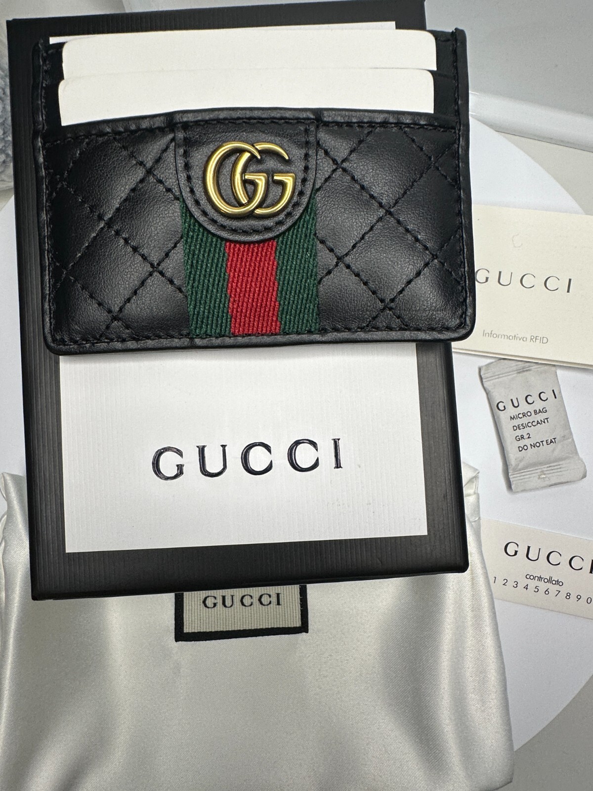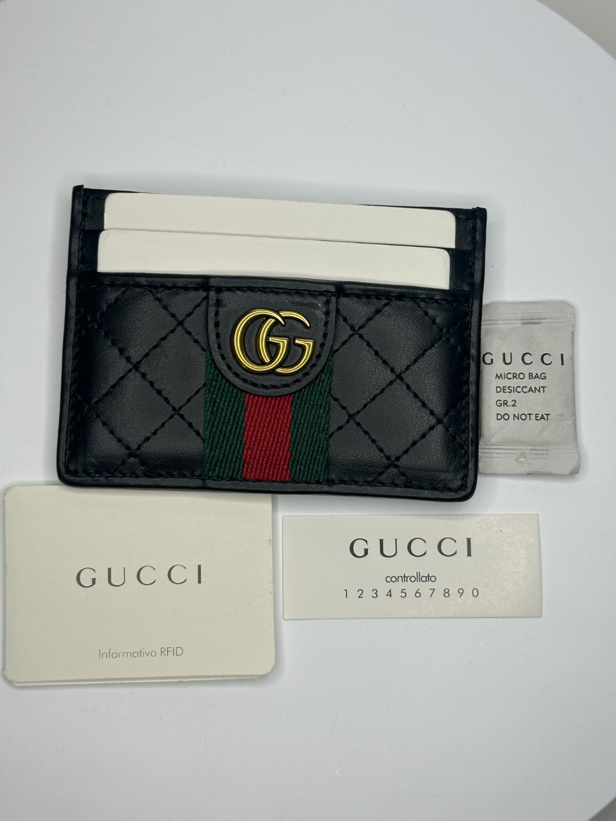 Gucci black marmont cardholder wallet. comes with box, dust bag, cards. Double G Four card slots, one open pocket 4"W x 2.5"H Listing and template services provided by inkFrog