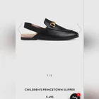 These slippers are absolutely adorable and look just like the adult version! The black leather is sleek and high-quality, and the gold Horsebit adds a luxe touch. They run a bit small, so sizing up is a good idea. Even though they were tried on in-store, they’re in perfect condition—no signs of wear. Perfect for little fashionistas who want to rock the Gucci look!