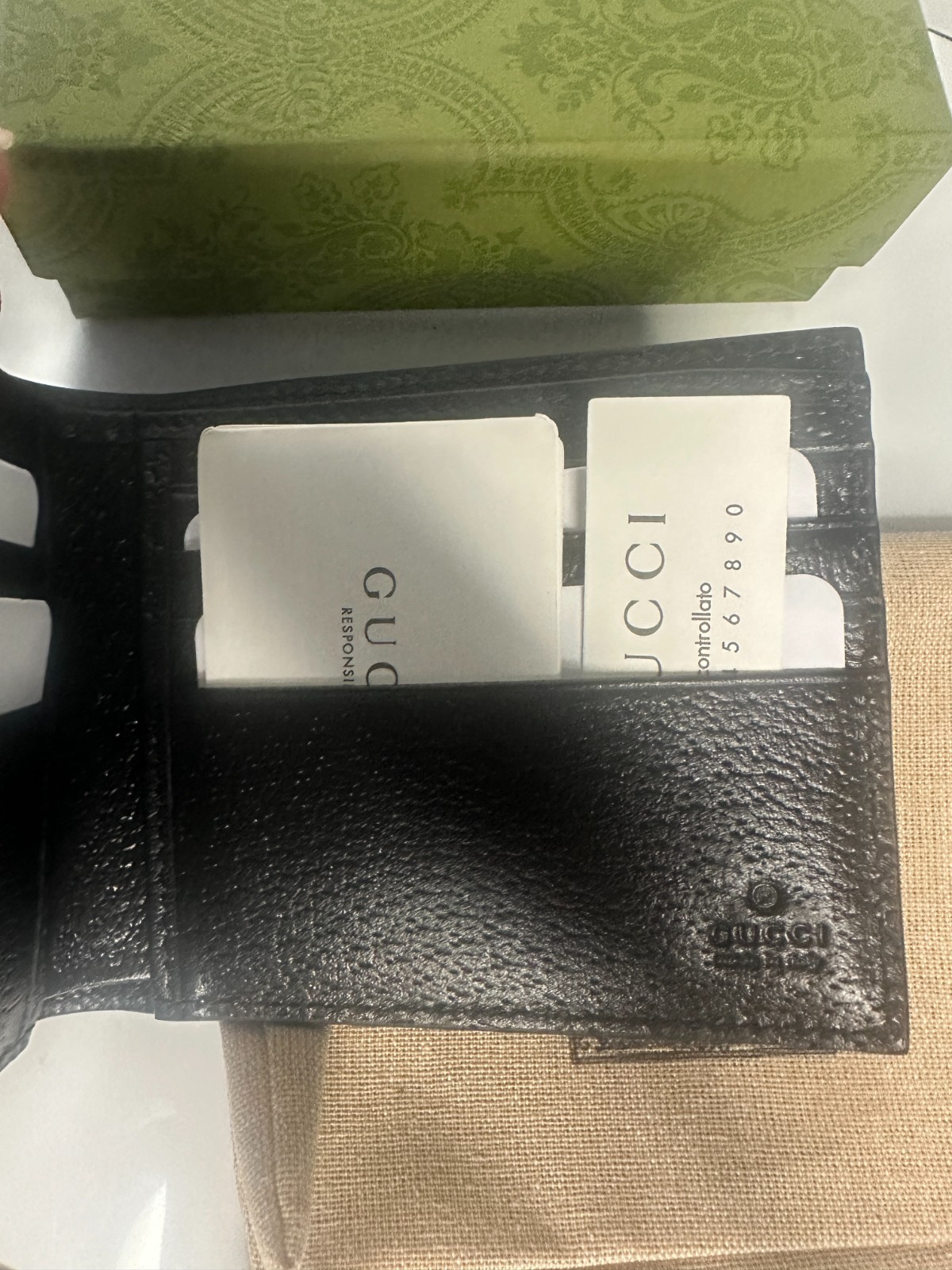 The wallet includes credit 8 card slots and a classic bifold design. comes with box, cards, and dust bag.