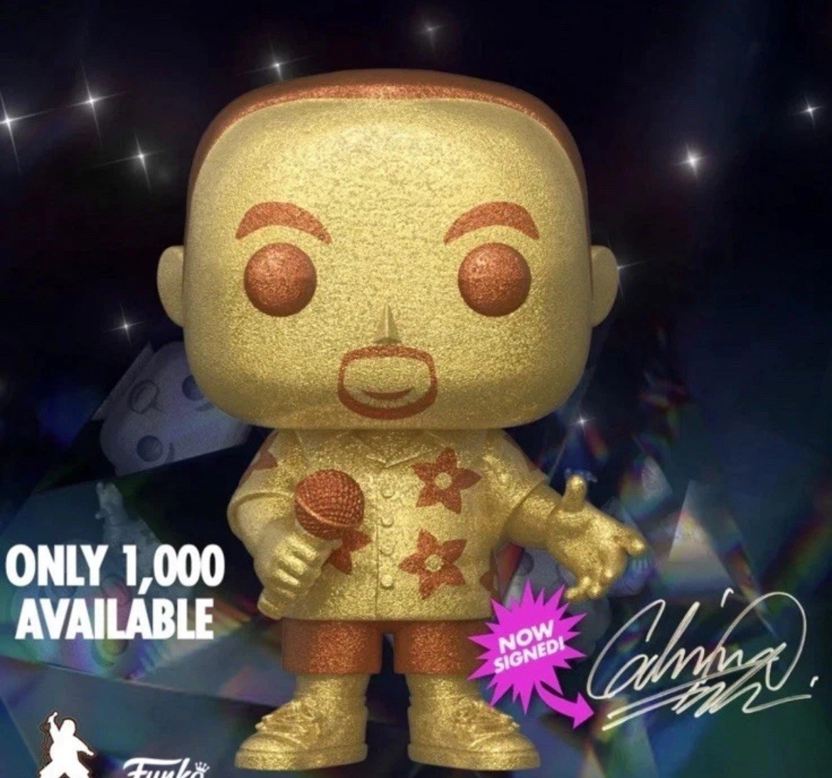 The product is a limited edition Gabriel Iglesias Fluffy Funko Pop Gold Diamond vinyl figure, signed by the artist himself. This collectible piece is part of the Pop! Vinyl product line and features a gold color with a diamond design, standing at 4 inches tall. With a production run of only 1,000 pieces, this exclusive item is a must-have for fans of comedy and collectors of unique collectible figures. The original packaging remains unopened, adding to the appeal of this special release from Funko.