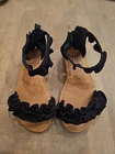 Gap Kids Girls Sz 12 Black ruffle sandals back zip Ankle Strap Very Good Cond. Faux suede. There is a little scuff on each toe, and the bottom looks walked on. Otherwise, these look new. Very nice, cute sandals. From smoke free home. Happy to combine shipping on multiple purchases.