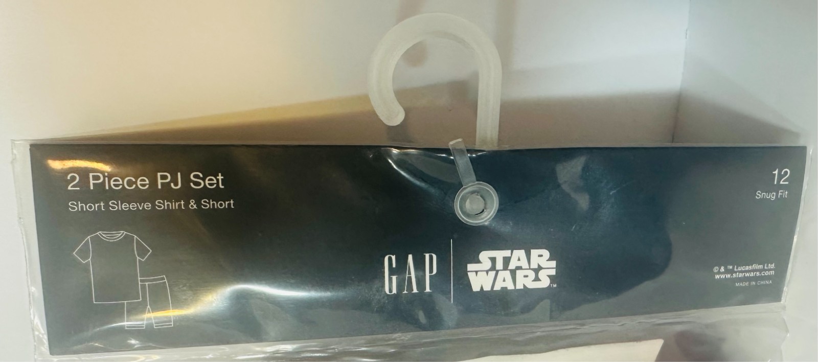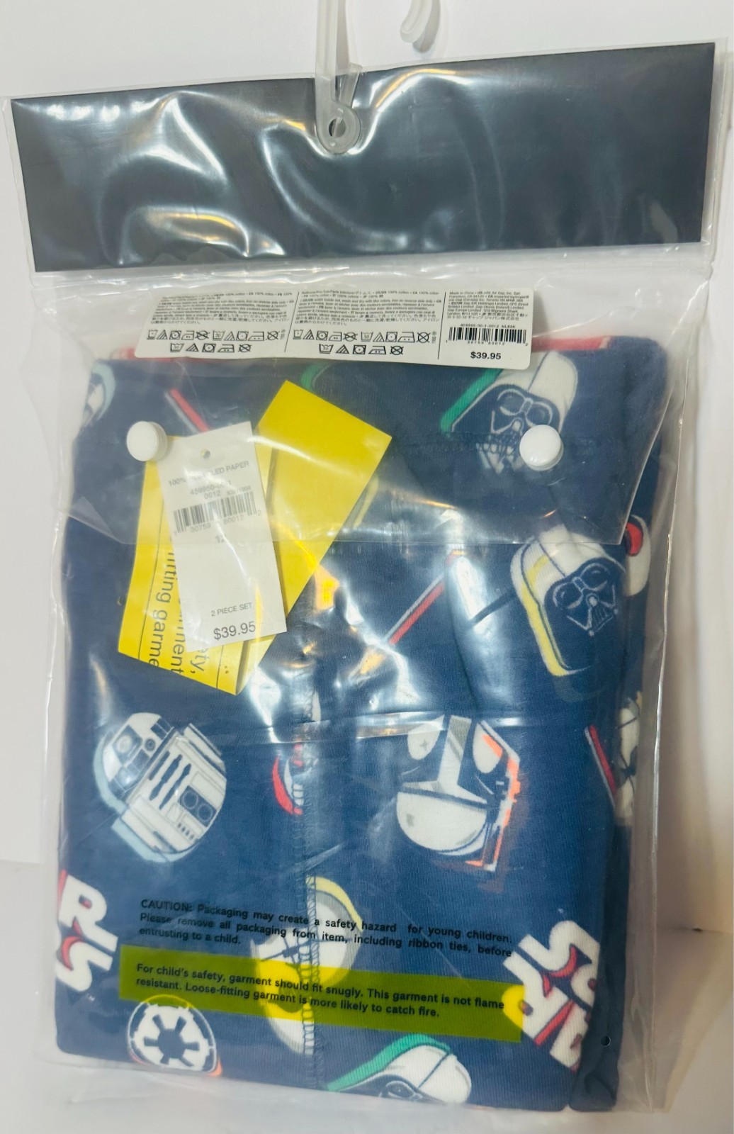 The Gap Star Wars kids 2 piece PJ set in size 12 is a fun and stylish sleepwear option for young boys. Featuring characters from the popular Star Wars franchise such as Chewbacca, Darth Vader, and R2-D2, this pajama set is sure to delight any Star Wars fan. Retail price of $39.95, set is in original packaging with tags, Made of soft cotton fabric, this set allows children to feel comfortable and secure while dreaming of their favorite characters from a galaxy far, far away. Perfect for bedtime or lounging, this 2 piece PJ set is a must-have for any Star Wars enthusiast's collection.