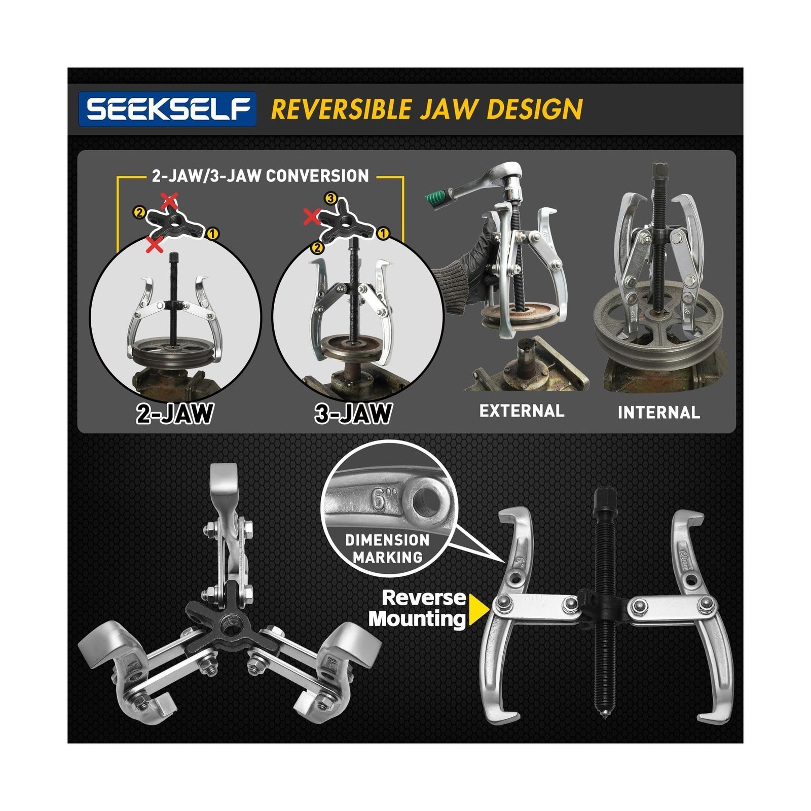 3" 4" 6" 8" Gear Puller Set, 2-Jaw/3-Jaw Bearing Puller Kit with Ratchet Wrench, Heavy Duty Pulling Tool, Reversible Jaw for Internal External Flywheel Gear Pulley Bearing Rotor Removal Description Features: Professional Puller Set: SEEKSELF Pullers are forged from high-strength heat-treated CrV steel, and equipped with thickened connecting plates and non-slip spacers for light/heavy duty work. It also comes with a labor-saving ratchet wrench and sockets, detailed instruction manual, sturdy blow-molded storage box and beautiful packaging. Reversible 2 or 3 Jaws Design: For easy storage, the tool needs to be assembled. Can be assembled as a two or three jaw puller (sharing the same set of brackets). Reversible jaws make it possible to convert from an external to an internal puller. Comes with detailed illustrated instructions and wrenches. Application: It can be used to remove gears, bearings, flywheels, hubs, ball races, crank pulleys, stuck rotors and sprockets, etc. (Before purchase, measure whether it meets the maximum working range of the pullers). Size Range: 4 different sizes of gear pullers are available by assembly. The maximum reach can exceed 3", 4", 6" and 8" (i.e. 75mm/100mm/150mm/200mm) when mounted to the lower mounting holes, and can be extended to 4.7", 6.7", 7.5" and 9.1" (i.e. 120mm/170mm/190mm/230mm) when switched to the upper mounting holes, covering common size ranges. Packing List: This Gear Bearing Puller Kit includes 4 sets of Jaw Pullers (assembly required), 1PCS 3/8-Inch Drive Ratchet Wrench with 3PCS Sockets(15mm, 18mm, 20mm), 2 sets of open-end wrenches are used for installation. It also comes with a nice instruction manual and packaging. Quality and Durability: The Gear Bearing Removal Tool set is suitable for both light and heavy work. The tool is forged from heat-treated CrV steel, which ensures the strength and durability of the Jaws and Ejector Rod. The surface of the jaw is finely polished, and the appearance texture is better. The thickened connecting plates, non-slip gaskets, and reinforced ejector rods make heavy-duty work more reliable. Tips: 1. Before operation, make sure that all jaws have firmly grasped the gears/bearings, etc.; 2. The set already includes the wrenches needed for assembly and disassembly. 2. Use the included wrench, or use it with your impact wrench, which is more labor-saving. Product Details: Manufacturer: SEEKSELF Brand: SEEKSELF Model: 3 Jaw Puller Set Item Weight: 14.52 pounds Package Dimensions: 15.2 x 11.02 x 3.11 inches Item model number: PULLER-4P3J-BLUE Manufacturer Part Number: PULLER-4P3J Date First Available: May 3, 2025 Delivery We Do Not Ship Outside of the Continental US. Return Policy All items qualify for returns within 30 days of receipt. Buyer is responsible for return shipping on any item that is not damaged. Feedback We take our reputation seriously, we buy and sell online, so we understand the value of trust. If you are unsatisfied with your order, please contact us and we will work with you to resolve it to your satisfaction.