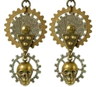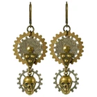 Gearhead Steampunk Femme Fatale earrings, made by Steph King of No Monet in California, USA! Vintage designed brass gears and decorative brass stampings are layered into multi-dimensional Steampunk earrings that fuse a modern twist with urban levity with the darker and more obscure side if Victorian style. The entire Steampunk Femme Fatale jewelry line is designed and made in the USA by Steph King. #SF-E3