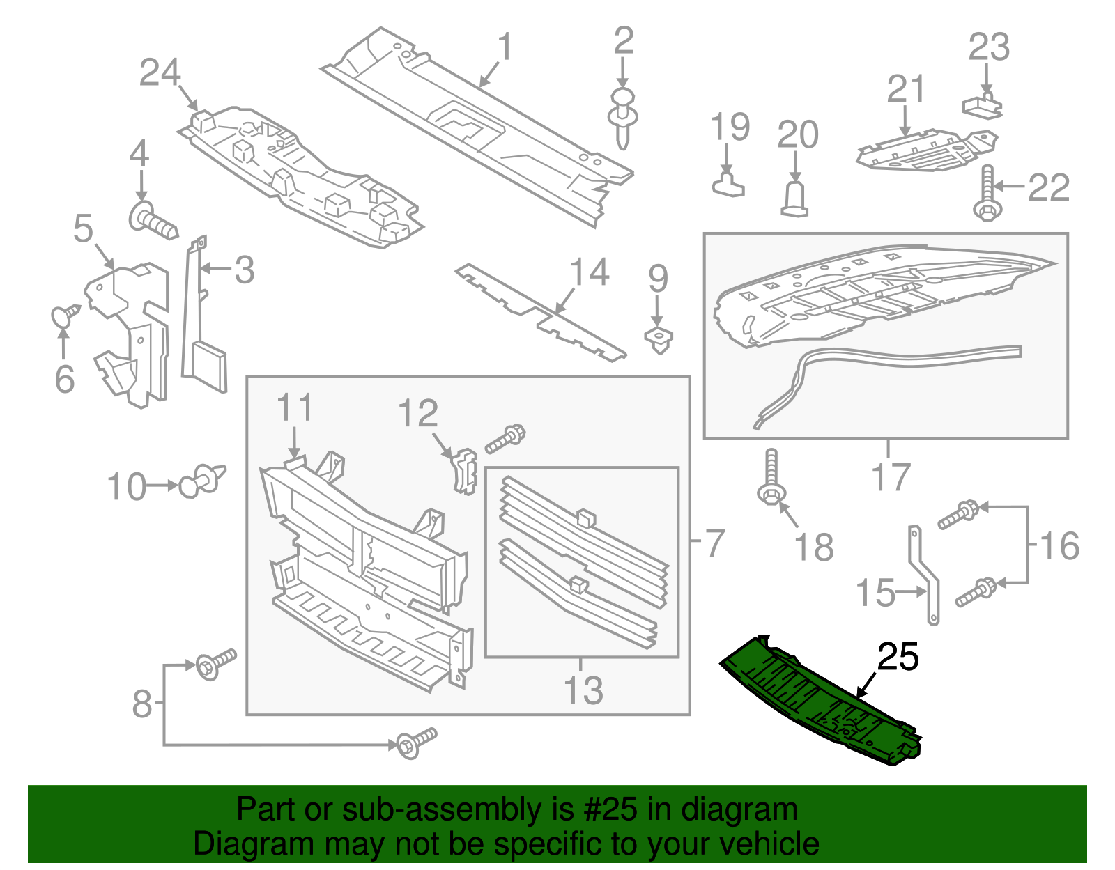 Hiller Parts Department Genuine Ford Lower Deflector JR3Z-8349-A Part can be found as # 25 in the diagram above Product Description 5.0L, 2018-23, without shutter. 2.3L, without shutter. Specifications Brand Ford Manufacturer Part Number JR3Z-8349-A SKU JR3Z-8349-A Product Genuine Ford Lower Deflector JR3Z-8349-A ONLY PART REFERENCE #25 ON THE DIAGRAM IS INCLUDED Terms and Conditions Thank you for shopping with us. Please find our policies below. If you have any other questions, please don't hesitate to contact us. Shipping Terms In stock orders ship within 24 hours. Weekend orders will be processed the next business day. If a part is not in stock and must be ordered from the manufacturer, it usually takes 2-3 days to arrive to us and will be promptly shipped to you. Most of the orders are shipped complete within 2-3 business days. A few of the parts ordered from the manufacturer may take up to 5-6 business days to arrive and will shipped to you immediately. Depending upon location, ground shipments usually take 2-7 days. Your order may be shipped Overnight for an additional cost. Oversized shipments will be additional; you will be contacted prior to shipping for approval. We cannot guarantee transit times for ground and oversize orders. Shipping Carrier substitutions may be made at our determination in an attempt to reduce shipping cost to the customer. In the unlikely event that a part has been placed on backorder or discontinued, we will do our best to try and find one for you as quickly as possible We do not ship COD orders. Return Policy Contact us to arrange for any returns. A copy of the invoice will need to be included with the return. Parts must be resaleable and in the original packaging. 20% restocking fee may be charged, if the return item is used or not sellable. We cannot take back used parts. We cannot take back installed or tried parts. Electrical parts are not returnable. We do reserve the right to refuse and return any parts we find have been installed, are used or do not meet the above criteria. Return request need to be within 30 days of receipt. Cancellation Policy An order or a portion of an order may be cancelled up until the time it is shipped and no longer in our possession. Home • Newsletter Signup • Contact Us Copyright © 2026 Hiller Parts Department , All rights reserved. Solution by RevolutionParts, Inc. :: Design by OCDesignsOnline