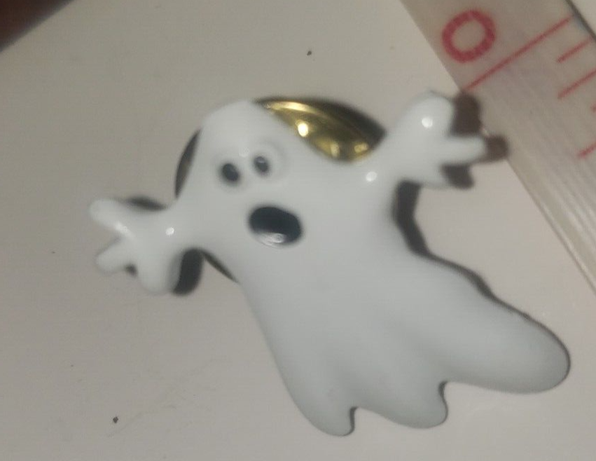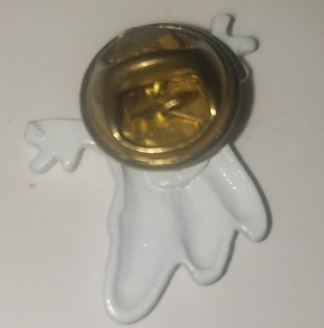 Add some spooky flair to your Halloween outfit with this Ghost hat pin. The pin features a menacing design of a ghostly figure, perfect for any Halloween enthusiast. The pin is signed by JJ White, adding a unique touch to this accessory. This lapel pin is a great addition to any collection of decorative collectibles, and is sure to make a statement. The white color of the pin complements the Halloween theme, and the pin is perfect for any occasion. Add this Ghost hat pin to your collection today!