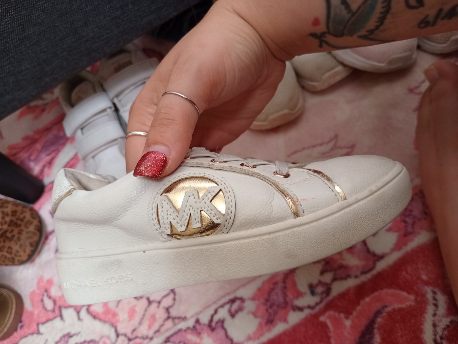 The Girls MK Shoes by Michael Kors are a stylish and comfortable pair of sneakers perfect for casual occasions. With a round toe, flat heel, and moderate cushioning level, these shoes are ideal for everyday wear. The white color and Michael Kors logo accents add a touch of sophistication to these solid sneakers, making them versatile for the summer, fall, and spring seasons. Made with synthetic upper material and rubber outsole, these athletic shoes are designed for walking and provide a trendy and practical option for young girls.