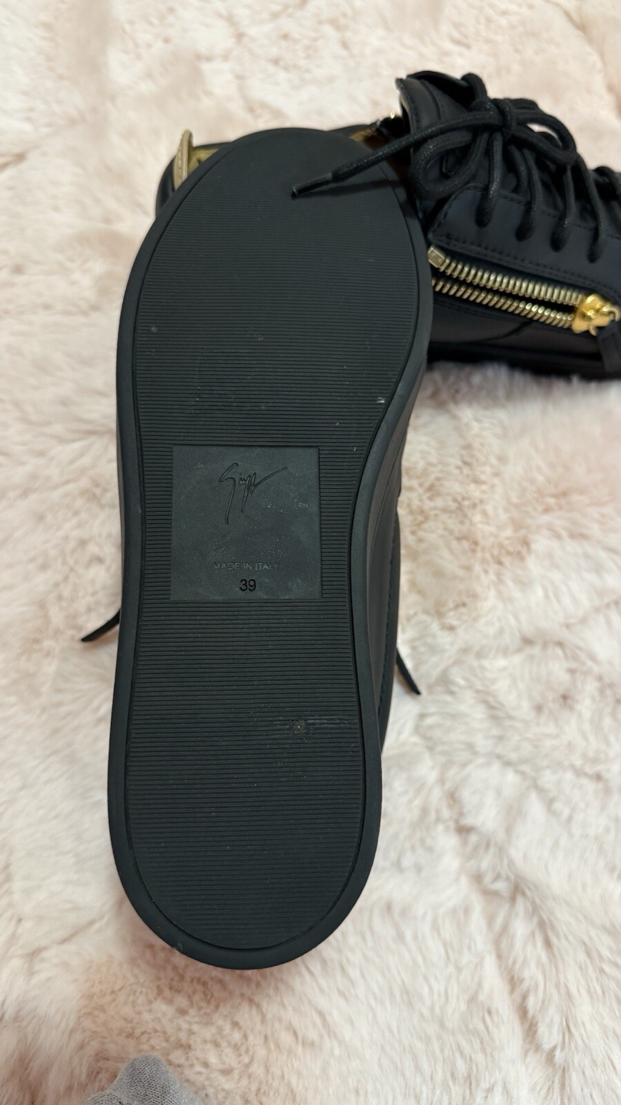 This listing is for a pair of Giuseppe Zanotti sneakers in size 39 for women. The sneakers come in a sleek black color with a stylish and modern design. They are made from leather, giving them a luxurious look and feel. The shoes are a trendy and fashionable choice for those looking for a high-end athletic shoe option.