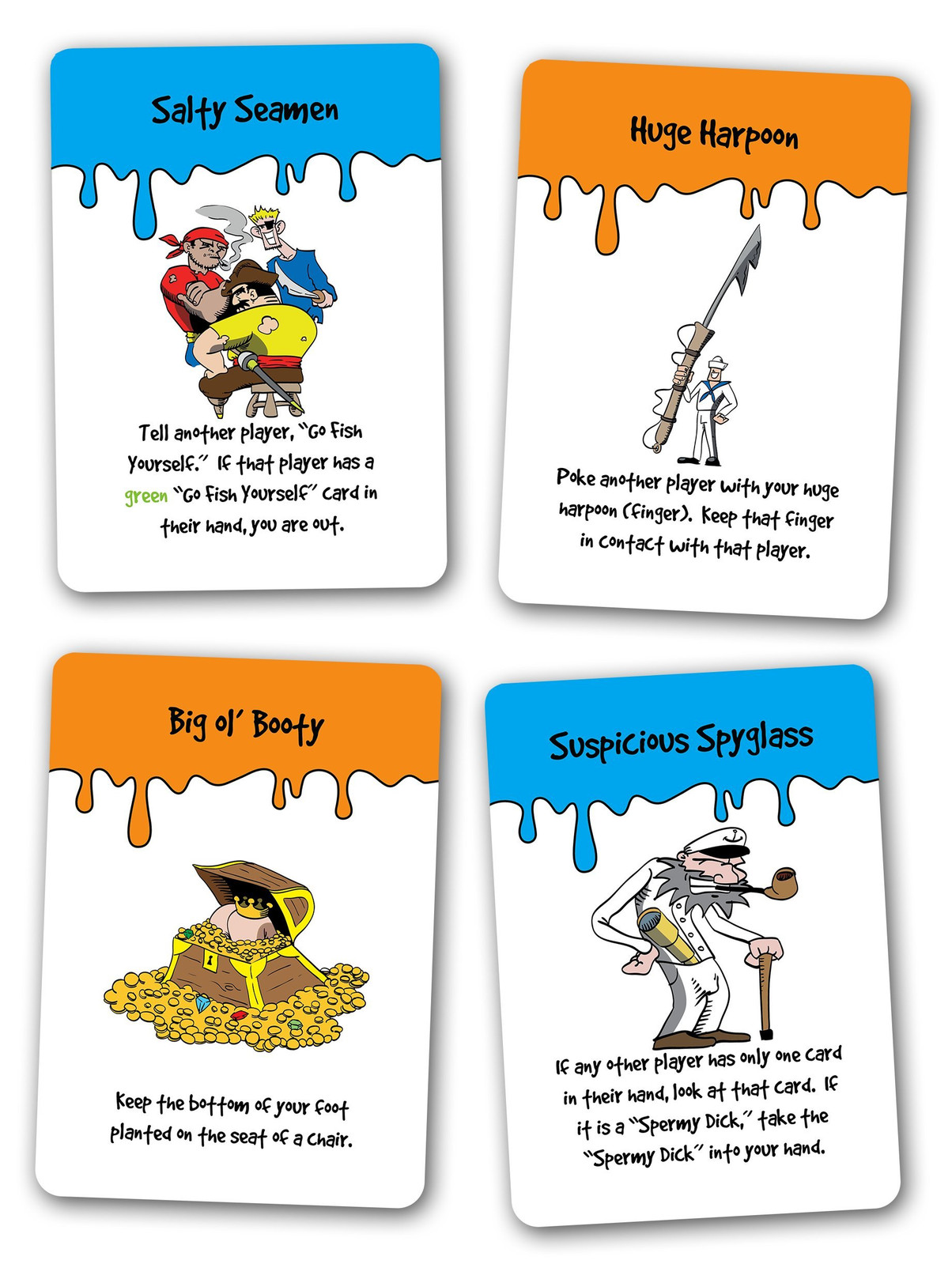 A wickedly fun game for grown-ups who like a challenge and sabotaging friends. 2 - 6 players (sense of humor recommended) Instead of hoarding boring cards, force other players to make pairs. Each pair comes with a set of ridiculous rules. If players can't follow the rules, they are out. Can you stay in the game? As pairs pile up, so do the shenanigans, forcing players get creative to stay in the game. 54 cards packed with off-the-wall challenges, fishy puns and nautical nonsense. Perfect for board game nights or as a drinking game. Combines with the Fishy and Naughty expansions for even more fun!