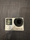 GoPro HERO 4 Action Camera Bundle - Silver - Mounts Harnesses Extra Accessories Pre-owned, working condition with wear on cover case and minor crack on camera body. Crack is near battery compartment batter compartment still closes and camera fits in case (see photo 9). Minor scratches on case and signs of wear such as light discoloration, but has never affected image quality for me. Review photos closely before buying. Bundle includes everything pictured : Multiple camera 3M mounts, 2 harnesses: chest and head harness with mounts, 2 batteries, Multiple replacement case screens (one with floating device) Does not include: memory cards, charging cable and anything else not pictured I've loved using this GoPro and have included example photos from this year! Message me if you have any questions or would like to see more images/videos BEFORE purchasing. Product Description: Record yourself in high performance activities with the GoPro Hero4 silver camera. The Hero4 utilizes an easy to use touch-display for convenience, and captures video and images for 1080p60 and 720p120, among other video resolutions. The camera features 12 MP with up to 30 frames per second. It also has a built in Wi-Fi and Bluetooth with Protune for photos and video. It is waterproof up to 131 feet, for when you are surfing a great wave on your next vacation. Videos are filmed in an MP4 file format and are created from frames captured at set intervals to create a time lapse video. GoPro also has an app that allows you to preview and play back videos and photos. With additional advanced features, this power packed camera is an adventurer's dream.