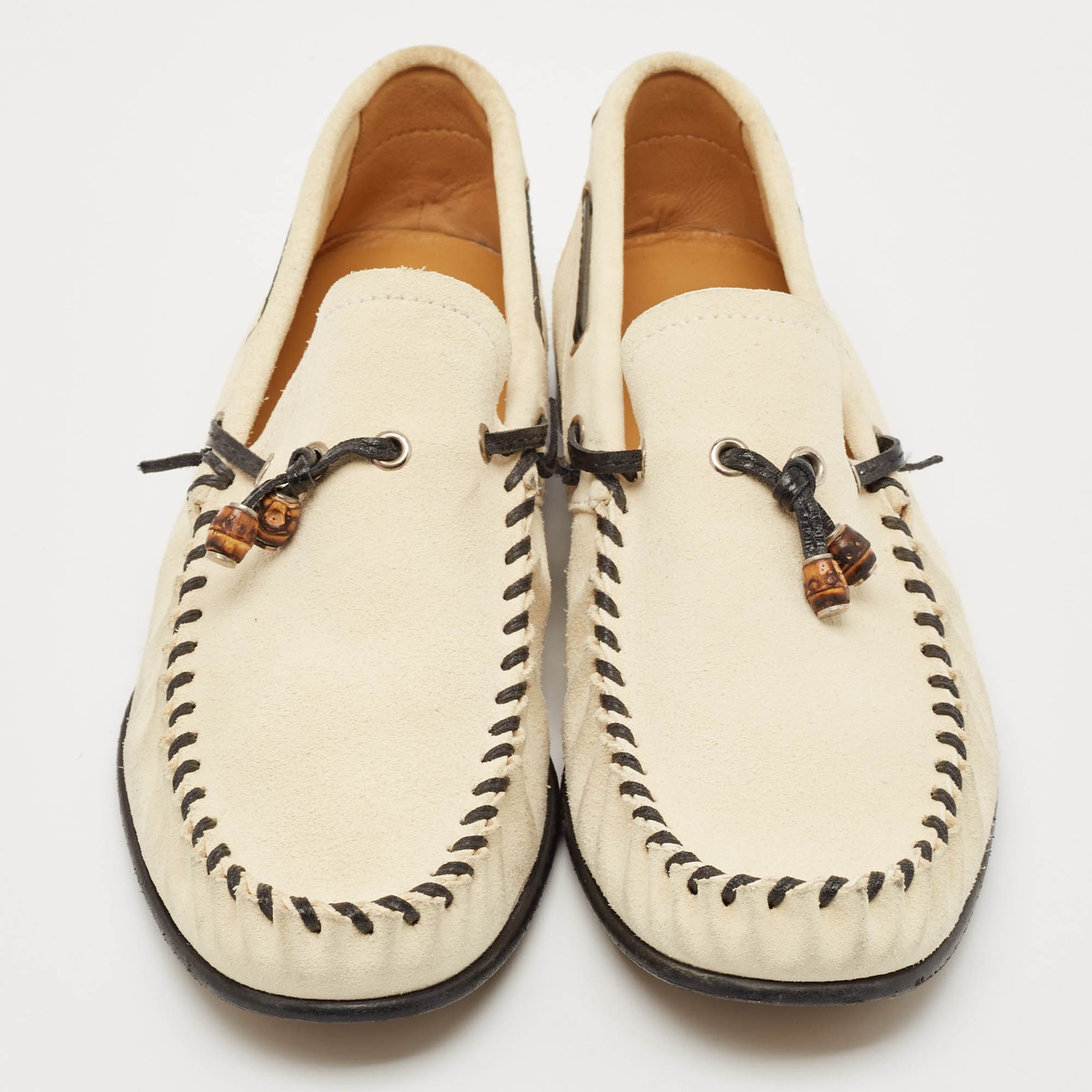 Our eBay Store About Us Contact Us Add to Favorite Sellers Gucci Beige Suede Bamboo Tassel Slip On Loafers Size 425 Practical, fashionable, and durable—these designer loafers are carefully built to be fine companions to your everyday style. They come made using the best materials to be a prized buy. Product Details Brand Gucci Color Beige Includes The Luxury Closet Packaging Outsole Length 29 cm Outsole Width 9.5 cm Size 42.5 Certified by The Luxury Closet This item has gone through a detailed authentication process overseen by our experts. We offer a lifetime guarantee of authenticity on all our items. How We Check The in-house team of experts at The Luxury Closet is highly trained to verify the authenticity and the condition of the luxury products. They ensure that only 100% authentic items are put on sale.The evaluation process is unique with its own mix of assessment criteria and differs according to the category. Each item is evaluated based on the following combination of hallmarks, hardware, stitching, symmetry, material, craftsmanship, stamping, codes, hologram stickers, and packaging. Our authenticators also check if the items have been modified or amended (e.g., aftermarket diamonds, replaced batteries, repaired bags, etc.) International Buyers Import duties, taxes and charges are not included in the item price. These charges are the buyers responsibility. Please check with your country’s customs office to determine what these additional cost will be prior to buying.