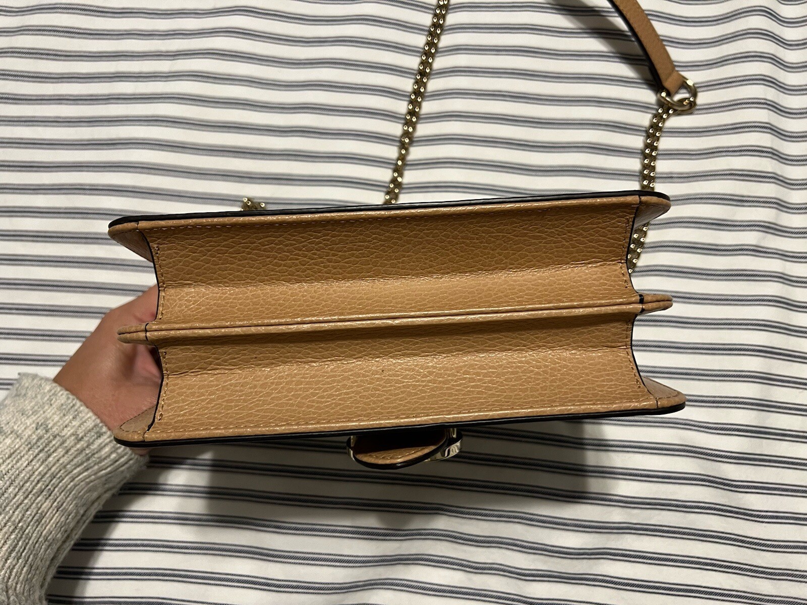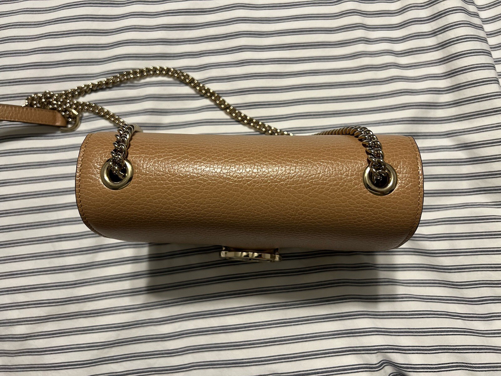 Elevate your style with this Gucci Interlocking G crossbody mini bag. The bag features a unique combination of beige canvas and leather in a rectangular shape with a zip closure. The bag width is 8.9 inches, bag height is 5.5 inches, and bag depth is 2.8 inches, making it a perfect fit for your essentials. The bag comes with a brown canvas handle/strap and gold hardware, adding a touch of luxury to the design. The interior is lined with beige microfiber and features a variety of compartments to keep your belongings organized. This Gucci crossbody mini bag is a must-have for any fashion-forward woman looking to add a touch of elegance to her everyday style.