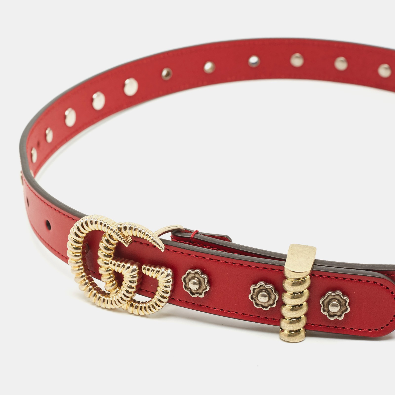 Gucci turns up the drama with this red leather belt featuring an ornate GG Torchon buckle. Sculptural and statement making, it’s a 75CM waist cinching piece designed to inject passion and polish into any look.Certified by The Luxury Closet - This item has gone through a detailed authentication process overseen by our experts. We offer a lifetime guarantee of authenticity on all our items. Import duties, taxes and charges are not included in the item price. These charges are the buyers responsibility. Please check with your country’s customs office to determine what these additional cost will be prior to buying. Our eBay Store About Us Contact Us Add to Favorite Sellers Gucci Red Leather GG Torchon Embellished Buckle Belt 75CM $447.7 Gucci turns up the drama with this red leather belt featuring an ornate GG Torchon buckle. Sculptural and statement making, it’s a 75CM waist cinching piece designed to inject passion and polish into any look. Product Details Brand Color Red Dimensions Material Leather Size 75CM Outsole Width Outsole Length Heel Height Includes Certified by The Luxury Closet This item has gone through a detailed authentication process overseen by our experts. We offer a lifetime guarantee of authenticity on all our items. How We Check The in-house team of experts at The Luxury Closet is highly trained to verify the authenticity and the condition of the luxury products. They ensure that only 100% authentic items are put on sale.The evaluation process is unique with its own mix of assessment criteria and differs according to the category. Each item is evaluated based on the following combination of hallmarks, hardware, stitching, symmetry, material, craftsmanship, stamping, codes, hologram stickers, and packaging. Our authenticators also check if the items have been modified or amended (e.g., aftermarket diamonds, replaced batteries, repaired bags, etc.) International Buyers Import duties, taxes and charges are not included in the item price. These charges are the buyers responsibility. Please check with your country’s customs office to determine what these additional cost will be prior to buying.