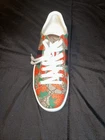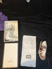 The Gucci Women's Ace "Strawberry Beige" sneakers in size 38 are a stylish and comfortable option for casual wear. With a low top design, lace-up closure, and round toe shape, these sneakers feature a flat heel for all-day comfort. Made of leather with a rubber outsole, they are perfect for the summer, fall, and spring seasons. The beige color and Gucci branding add a touch of luxury to these sneakers, making them a versatile addition to any woman's wardrobe. Made in Italy, these Gucci Ace sneakers combine fashion and functionality for a modern look. SHOES HAVE BEEN TRIED ON BUT NOT WORN OUT.