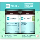 Ingredients: Omega 3 1000mg, Gelatin Food Grade, Humectant (INS 422) (INS 420), Preservative (INS 218), Purified water Directions: Consume 1 tablet daily or as prescribed by your healthcare professional. From the brand Previous page Explore our range! Next page Product Description Benefits of HealthKart HK Vitals Multivitamin! Improves Energy, Strength, and Stamina B Complex Vitamins present in HealthKart Multivitamin for men and women helps to metabolize amino acids. The essential amino acids boost the repair of muscle fibers and also provide energy. Boosts Immunity The combined effect of Vitamin A, C, D, E, B2, B6, and B12, Folic Acid, Iron, Selenium & Zinc in Healthkart Multivitamin tablets helps activate immune cell activities to build immunity. Maintains Bone and Joint Health HK Vitals Multivitamin Supplement (from the house of HealthKart) contains Calcium, Vitamin D3, Magnesium & Zinc that support bone formation, repair, and healing. Vitamin D3 helps in calcium absorption to boost bone and joint health. Benefits of HealthKart HK Vitals Fish Oil with Omega 3! Promotes Muscle Strength and Stamina HK Vitals Fish Oil Supplement helps improve joint flexibility and fosters muscle building. Enriched with Omega 3 fatty acids, it helps reduce inflammation to ensure good joint health. Improves Heart Health These fish oil capsules for men and women contain essential ‘good’ fats and help reduce cholesterol levels of the body, enhancing heart health. Supports Brain Health This fish oil supplement helps improve brain function. It is also vital in preventing cognitive decline with age.