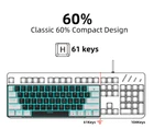 Features : High-quality mechanical switches: With the use of blue switches, it provides users with a more comfortable typing experience with clear paragraph breaks. Durable mechanical switches: The switches have a lifespan of up to 20 million clicks, ensuring durability and reducing the need for frequent replacement. Compact design: The 61-key mechanical keyboard's small size makes it more convenient to use and takes up minimal desktop space. Various lighting modes: The keyboard features a cool ice-blue backlight with various lighting modes that add style to the user's experience. User-centered design: The keyboard adopts an ergonomic design, ABS material, and dual-color injection molding technology. The key caps do not fade even after double-clicking, providing users with a comfortable and worry-free experience. The cable length is 1.8 meters, providing convenience and flexibility for users of Windows, Mac OS, Linux, and other latest systems. Specification : Optional Color: Black&Red / Black&White Number of keys: 61Keys(Full key conflict free) Material: ABS Axis type: green axis Key technology: mechanical axis Waterproof function: supports waterproofing Backlight effect: Ice blue light design (19 different lighting modes) Number of clicks: 20 million Keycap process: dual color injection molding With or without hand support: No Does it have multimedia functionality: Yes Plug and Play: Yes Voltage/current: 150mA (MAX) System support: Windows Vista/XP/7/8/10/11, MAC IOS, and Linux system Line length: 175cm Product size: 29.1*10.1*3.8cm Product weight: 485g Packaging size: 32.2*13.2*4.7cm Packaging weight: 637g Products list: 1 x 61 key mechanical keyboard 1 x USB TYPE-C data cable (1.75M) 1 x English instruction manual