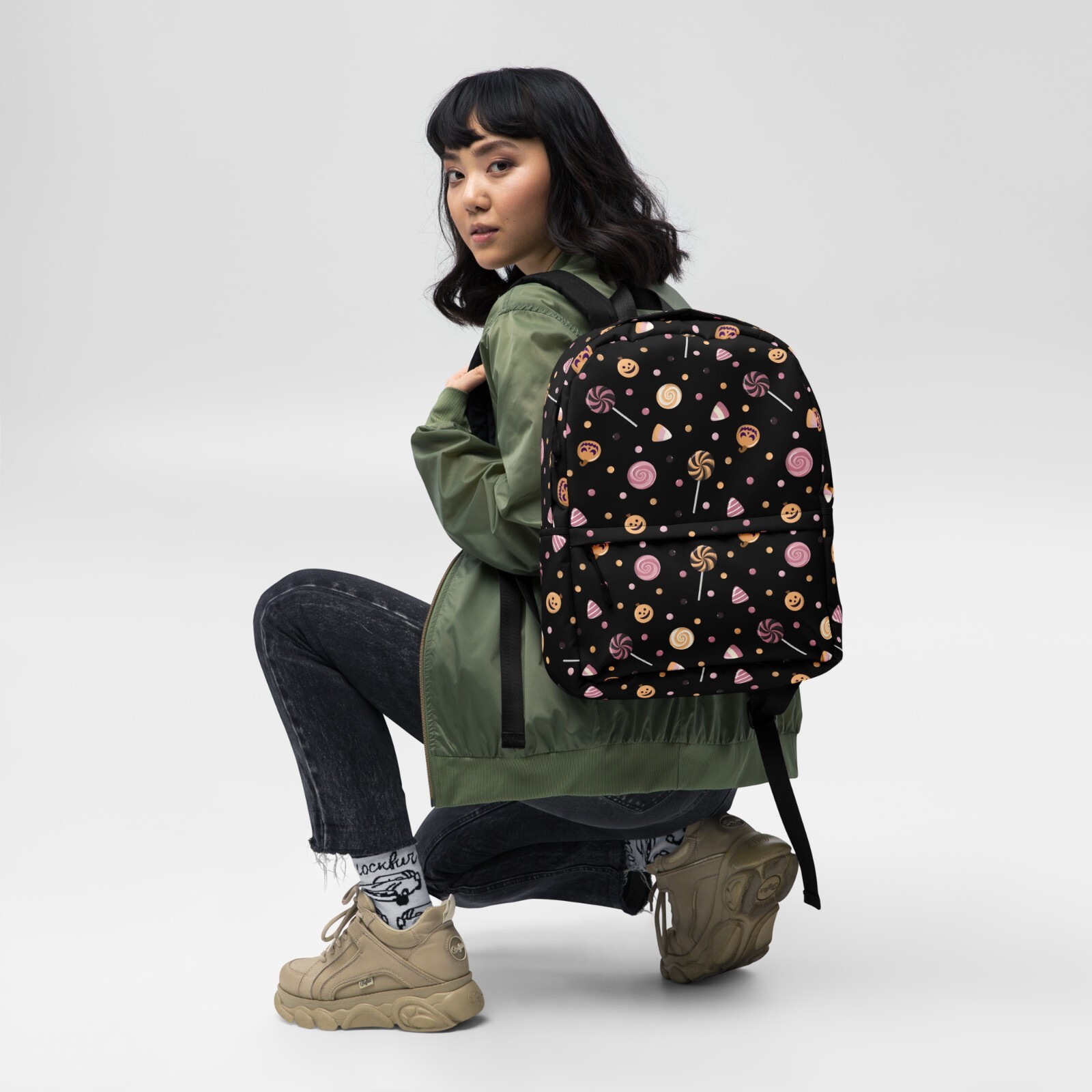 This medium size backpack with a colorful Halloween candies print with a black background is just what you need for daily use or sports activities during fall! The pockets (including one for your laptop) give plenty of room for all your necessities, while the water-resistant material will protect them from the weather. • Made from 100% polyester • Dimensions: H 16⅞" (42cm), W 12¼" (31cm), D 3⅞" (10cm) • Fabrig weight: 9 oz./yd.² (305 g/m²) • Maximum weight limit: 44lbs (20kg) • Water-resistant material • Large inside pocket with a separate compartment for a 15” laptop, front pocket with a zipper, and a hidden pocket with zipper on the back of the bag • Top zipper has 2 sliders with zipper pullers • Silky lining, piped inside hems, and a soft mesh back • Padded ergonomic bag straps from polyester with plastic strap regulators • Blank product components sourced from China This product is made especially for you as soon as you place an order, which is why it takes us a bit longer to deliver it to you. Making products on demand instead of in bulk helps reduce overproduction, so thank you for making thoughtful purchasing decisions! NOTE: Please keep in mind that colors can sometimes appear slightly different due to variations in screen resolutions and device settings.