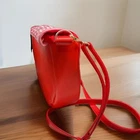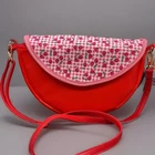 This handmade saddle bag purse is a must-have for any fashion-forward woman. The cherry gingham checked pattern and red leather exterior color make it perfect for a party, cocktail event, or casual outing. The bag features a magnetic closure and adjustable crossbody strap for comfort. The interior is fully lined and includes inner pockets for storage. The leather and playful cherry gingham checked cotton fabric give this purse a unique and stylish look. With its semi-circle shape and cross-body strap, this bag is perfect for any occasion. Add this beautiful, handmade bag to your collection today!