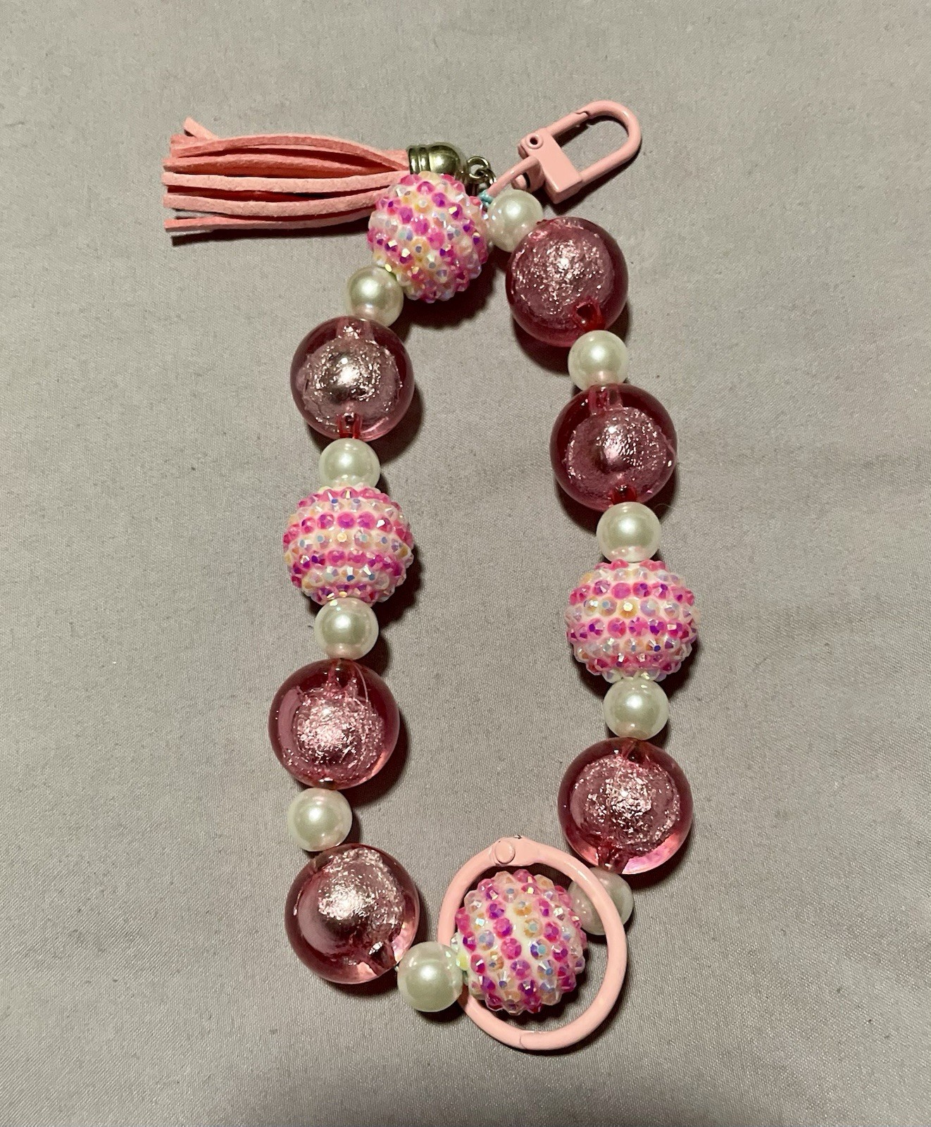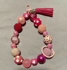 This handmade wristlet keychain features a pink ribbon, symbolizing breast cancer awareness. It is designed specifically for women, making it a thoughtful and stylish accessory to show support for breast cancer awareness. The keychain is a subtle yet meaningful way to promote awareness and support the cause.