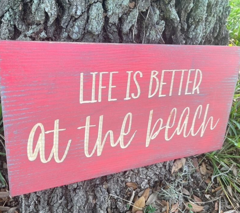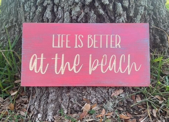 “Life is better at the beach” wood decor sign. Handmade wall decor with a CNC machine. Distressed blue and pink paint. Engraved lettering for a 3D look. Sign is 18 inches wide and 9 inches tall. 2 Keyhole hooks are located on the backside for hanging. Multiple top coats for added protection.