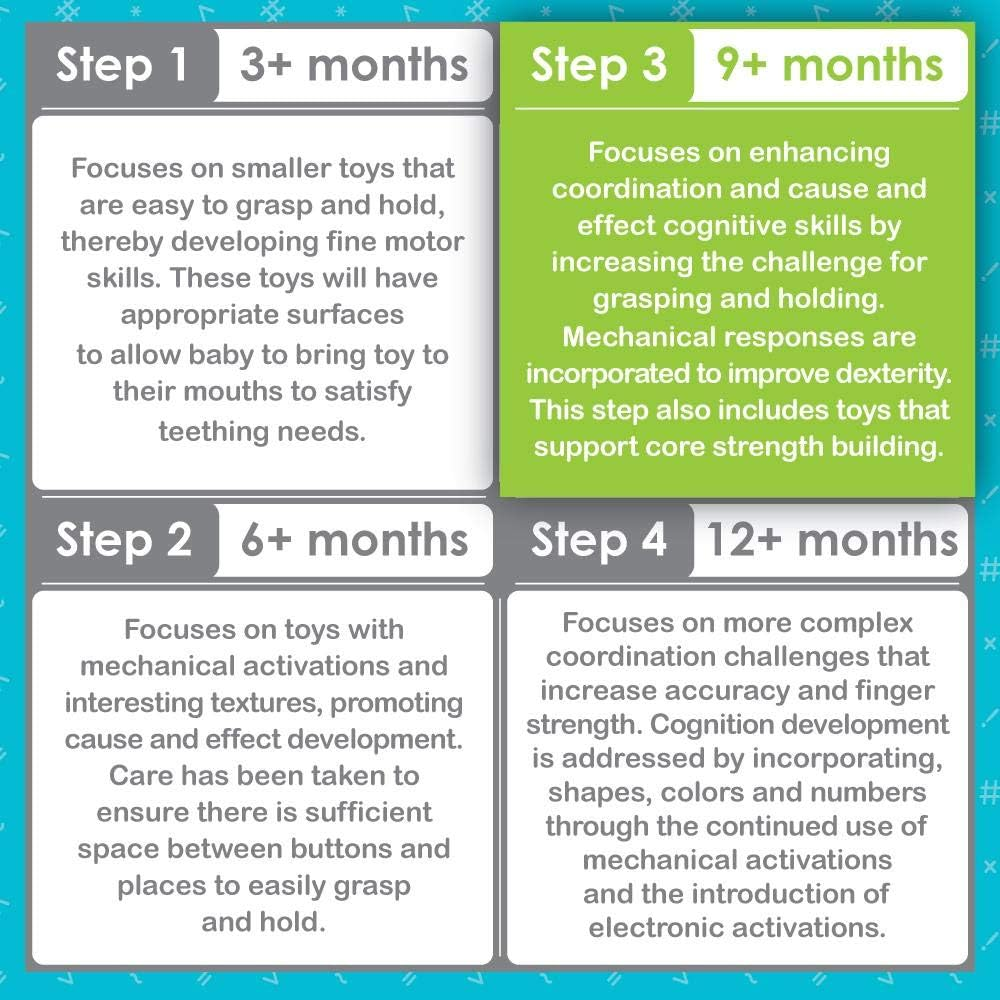 PERFECT FOR CHILDREN 9 MONTHS AND UP: The Happy Hammer designed by Smart Steps is perfect for children 9 months and up, developing little one’s cause and effect skills, grasping and holding ability, and auditory cues. MUSICS AND LIGHTS STIMULATE AUDITORY CUES: Lights and sounds are activated when the Happy Hammer is hit on either side. The interactive sounds are great for developing auditory cues. SOFT ENDS ALLOW FOR EASY ENGAGEMENT: The double-sided hammer is made with soft silicone which makes the Happy Hammer easy for children to engage. TEXTURED HANDLE PROMPTS GRASPING AND HOLDING SKILLS: The handle of the Happy Hammer has been textured and designed to promote kid’s grasping and holding ability. QUALITY EXCEEDS U.S. SAFETY REQUIREMENT: All the Smart Steps toys are made to meet and exceed high quality standards. Recommended age 9 months and up At SMART STEPS by baby trend, we value each development and learning stage for your precious little ones. Our Happy Hammer s is perfect for helping children develop cause and effect skills, grasping and holding ability and auditory cues. Its interactive music and lights can be activated when the Happy Hammer is hit on either side, improving kid’s dexterity and auditory development. All the SMART STEPS by baby trend toys are made to meet and exceed high quality standards. Its double-sided hammer is made with soft silicone, which makes the toy easy for children to engage; the handle of the Happy Hammer has been textured and designed to promote grasping and holding. Enjoy learning while having fun with the Happy Hammer made by SMART STEPS by baby trend!The Happy Hammer is featured under Step 3 of the SMART STEPS by baby trend program. Recommended for babies 9 months and up.