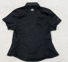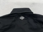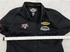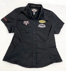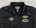Brand: Harley-Davidson Color: Black Season: Fall, Spring, Summer, Winter Theme: Motorcycle Department: Women Neckline: Collared Size: L Features: All Seasons, Easy Care, Stretch Sleeve Length: Short Sleeve Size Type: Regular Vintage: Yes Closure: Button Style: Basic Accents: Button, Embroidered Occasion: Casual Material: Cotton, Elastodiene Country/Region of Manufacture: Unknown Pattern: Solid Fit: Regular Type: Button-Up