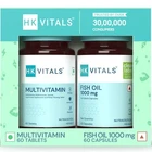 About this item STRENGTHENS JOINTS- HealthKart HK Vitals Fish Oil Omega 3 consists of 1000mg bioavailable fish oil with 180mg EPA & 120mg DHA. These fatty acids help in inflammation reduction for great joint health BOOSTS MUSCLE BUILDING- HK Vitals Omega 3 Fish Oil has fatty acids that may reduce post-workout muscle soreness, and help with Delayed Onset Muscle Soreness (DOMS) and muscle building IMPROVES HEART HEALTH- These fish oil omega 3 capsules 1000mg contain essential ‘good’ fats needed for optimal heart health. EPA (Eicosapentaenoic Acid) helps reduce cholesterol levels in the body, enhancing heart health MAINTAINS BRAIN FUNCTION- These omega 3 fish oil capsules for women & men are packed with DHA (Docosahexaenoic Acid) which helps in the normal functioning of the brain SUPPORTS SKIN HEALTH- Daily dose of HK Vitals Fish Oil Omega 3 is ideal to promote healthy skin by reducing inflammation and locking in the moisture making it look healthy and glowing RECOMMENDED DOSAGE- RDA of combined EPA & DHA is 250-500 mg. HealthKart HK Vitals Fish Oil 1000mg provides 300 mg of combined EPA & DHA and easily meets your RDA Omega 3 requirement Ingredients: Omega 3 1000mg, Gelatin Food Grade, Humectant (INS 422) (INS 420), Preservative (INS 218), Purified water Directions: Consume 1 tablet daily or as prescribed by your healthcare professional. Product Description Benefits of HealthKart HK Vitals Multivitamin! Improves Energy, Strength, and Stamina B Complex Vitamins present in HealthKart Multivitamin for men and women helps to metabolize amino acids. The essential amino acids boost the repair of muscle fibers and also provide energy. Boosts Immunity The combined effect of Vitamin A, C, D, E, B2, B6, and B12, Folic Acid, Iron, Selenium & Zinc in Healthkart Multivitamin tablets helps activate immune cell activities to build immunity. Maintains Bone and Joint Health HK Vitals Multivitamin Supplement (from the house of HealthKart) contains Calcium, Vitamin D3, Magnesium & Zinc that support bone formation, repair, and healing. Vitamin D3 helps in calcium absorption to boost bone and joint health. Benefits of HealthKart HK Vitals Fish Oil with Omega 3! Promotes Muscle Strength and Stamina HK Vitals Fish Oil Supplement helps improve joint flexibility and fosters muscle building. Enriched with Omega 3 fatty acids, it helps reduce inflammation to ensure good joint health. Improves Heart Health These fish oil capsules for men and women contain essential ‘good’ fats and help reduce cholesterol levels of the body, enhancing heart health. Supports Brain Health This fish oil supplement helps improve brain function. It is also vital in preventing cognitive decline with age.