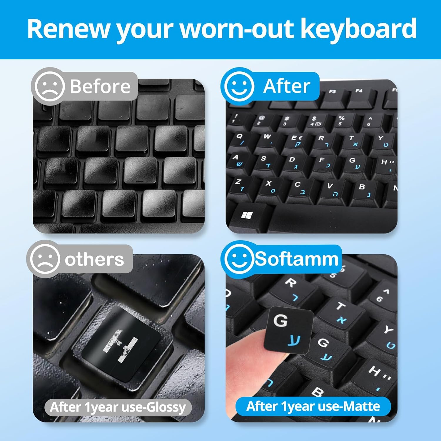 Hebrew Keyboard Stickers[5 in 1],Hebrew Blue Letter /Black Background Product Details Package Dimensions: 8.62 x 3.78 x 0.47 inches Item Weight: 0.634 ounces Manufacturer: Softamm Country of Origin: China Brand: Softamm Color: Hebrew Blue Letter /Black Background Compatible Devices: Laptop Material: Vinyl Special Feature: Scratch Resistant, Water Resistant 【 A Great Deal 】 The hebrew english keyboard stickers are designed to restore any faded or worn letters, making your keyboard look new again. This way, you won't need to purchase a new keyboard at a considerable expense. 【Premium Materials】 The laptop keyboard stickers are made of durable long-lasting vinyl materials with a matte texture, which offers you a comfortable tactile experience similar to the original keyboard. It will not fade for 5 years under normal use. 【Fashionable And Beautiful Design】 The hebrew laptop keyboard stickers can be easily applied and removed, and each letter sticker is precisely cut. Moreover, the F and J keys have corresponding notches that match the raised horizontal lines on your keyboard's F and J keys, making them more convenient to use. 【Save Your Time & Quick installation 】 The tweezers can help you quickly remove the small alphabet stickers and align with the keyboard keys, while the cleaning brush and cleaning cloth can help you quickly clean the keyboard surface from dust, water, and other debris.. 【Package List】 This hebrew keyboard stickers set includes 2 x Hebrew keyboard stickers, 1 x Tweezer, 1 x Keyboard Cleaning Brush, and 1 x Microfiber Cleaning Cloth,perfect for use on any laptops, notebooks, or PC computers.