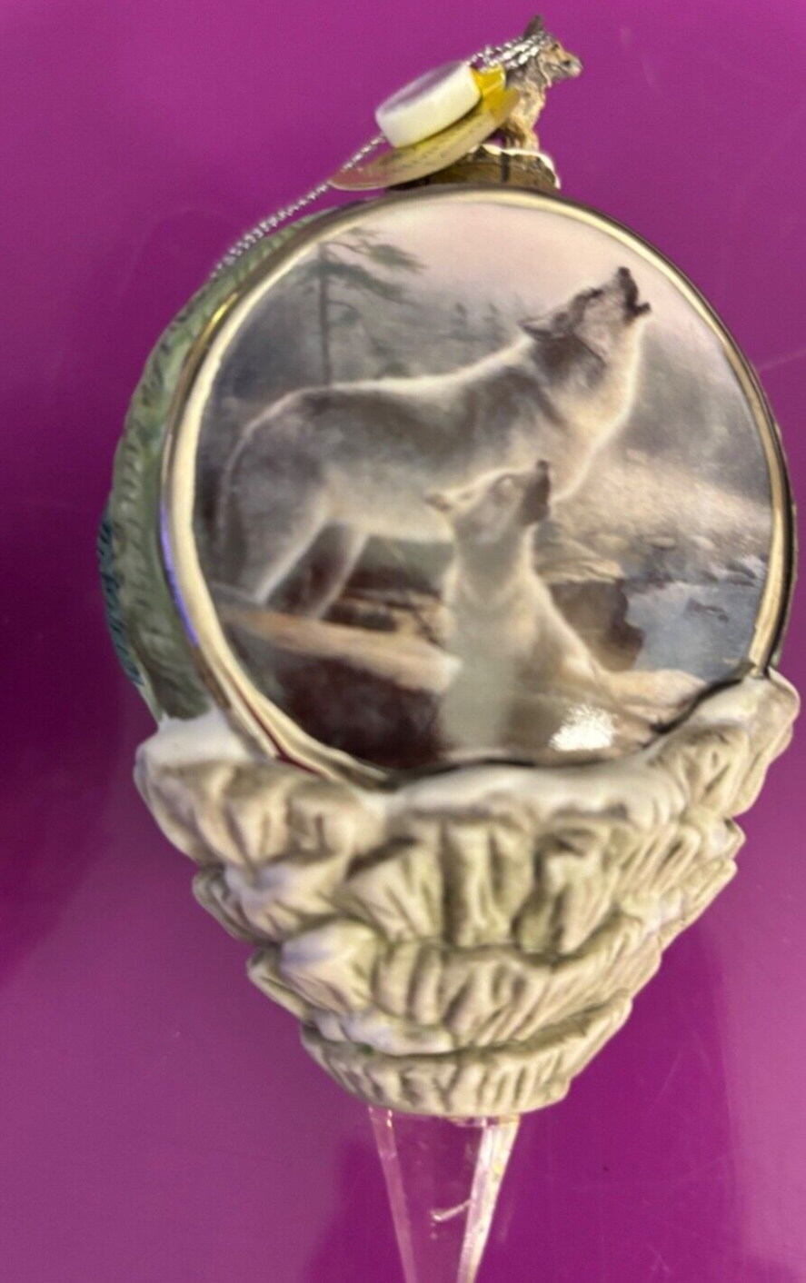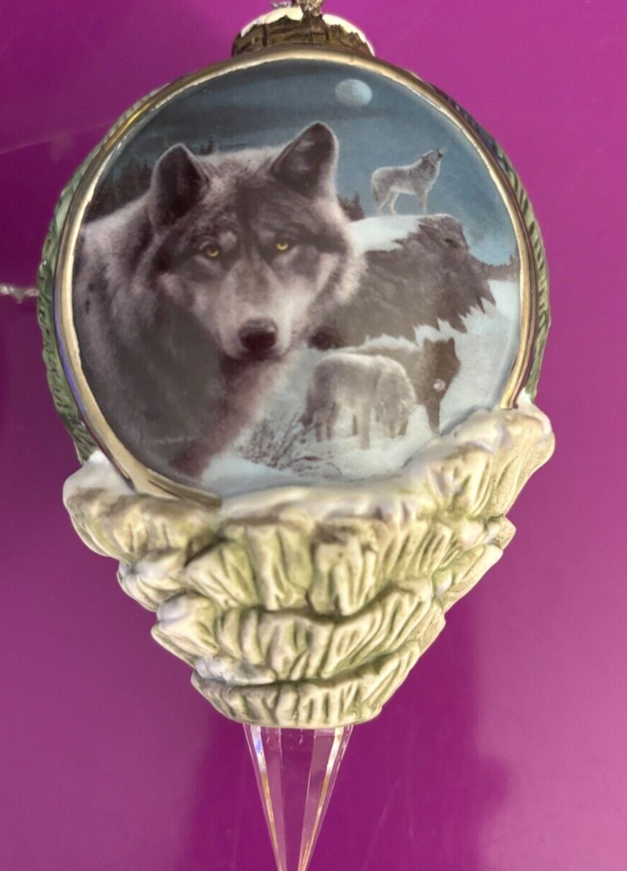 Experience the allure of the great outdoors with the Call Of The Wilderness Heirloom Porcelain Bauble from Bradford Exchange. This exquisite piece is crafted from high-quality porcelain, ensuring a delicate and timeless charm that complements any Christmas decor theme. Perfect for the holiday season, it's designed to capture the essence of nature's serene beauty. Whether displayed on your mantle or as part of a festive table spread, this bauble is sure to add a touch of elegance and warmth to your celebrations. Set includes : “Howling Lesson”, “Night Watch”, and “First Outing” #A4648 Never used/out of box Smoke Free home
