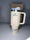 Brand new cream&pink hello kitty engraved Stanley tumbler. This Hello Kitty engraved Stanley tumbler is the perfect addition to any collection. With a 40 oz capacity, it keeps beverages hot or cold for up to 7 and 11 hours, respectively. The stainless steel material and pink color make it a stylish and durable choice for teens, adults, kids