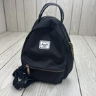 This Herschel Nova Mini Backpack is a stylish and functional accessory for any casual occasion. The bag is made of durable canvas material and features a zip closure, adjustable straps, and double handles for easy carrying. The gold hardware accents and red stripe inside add a touch of elegance to the design. The bag is lightweight and has a capacity of 6 inches in width, 11 inches in depth, and 13 inches in height with top handles. It also has multiple pockets for convenient storage. Whether you're running errands or going out with friends, this backpack is a great choice.