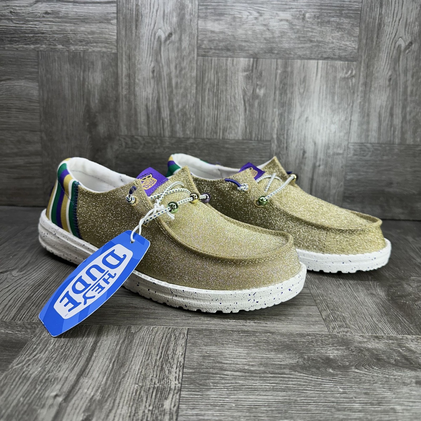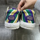 The Hey Dude Wendy Funk Mardi Gras Women's shoes in size UK 7, US 9, and EU 40 are a stylish and comfortable option for casual wear. These lightweight shoes feature a slip-on design with a low top shaft and a round toe shape, making them easy to wear for daily activities. The gold multicolored synthetic upper material, rubber outsole, and flat heel provide a comfortable and durable option for summer, fall, and spring seasons. Perfect for walking and adding a touch of fun to your outfit with the logo accents.