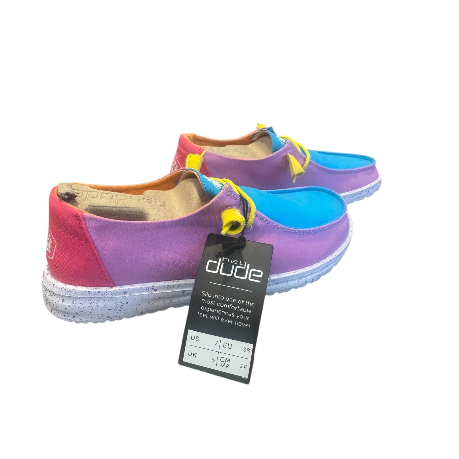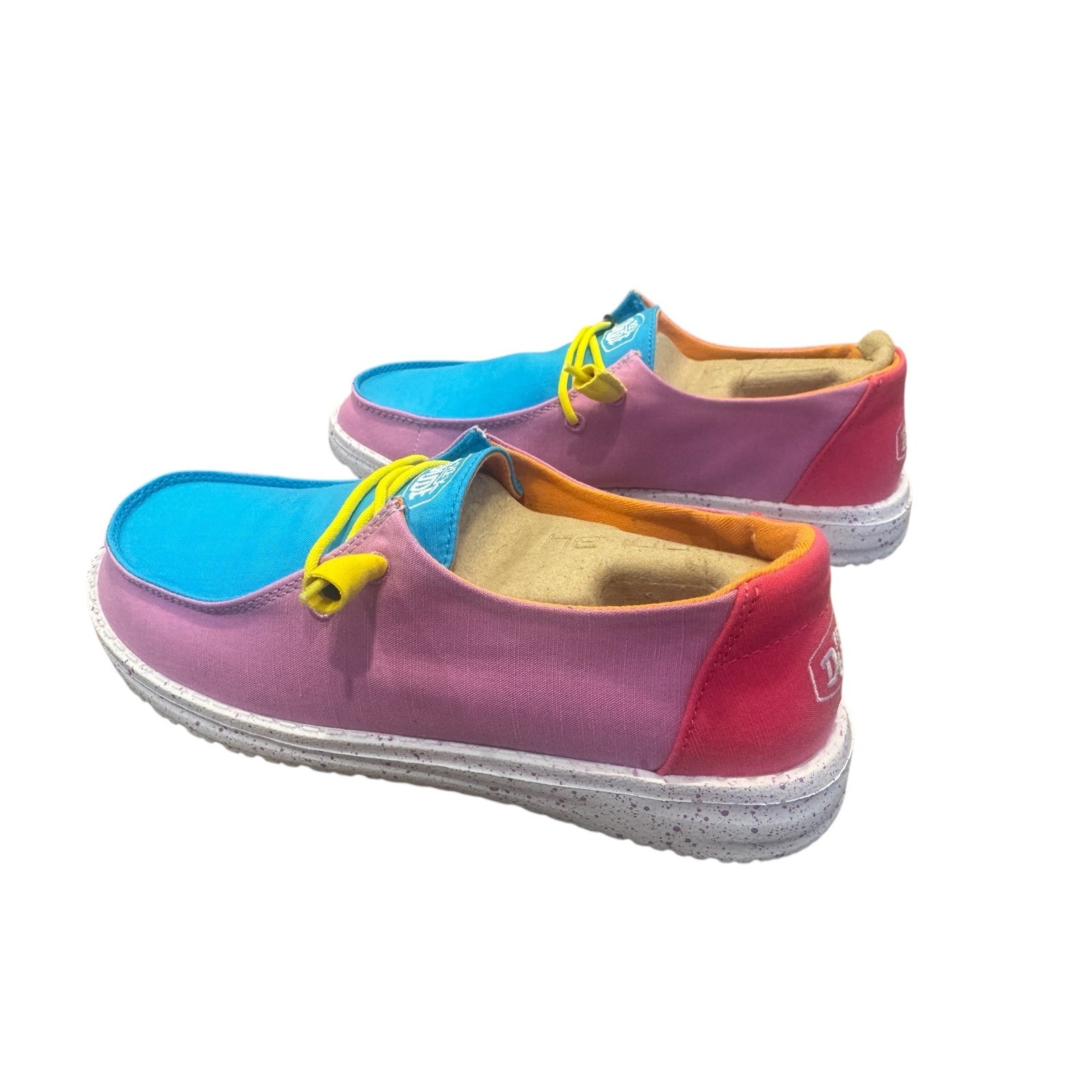Step into vibrant comfort with these eye-catching Hey Dude Wendy shoes. The delightful color block design featuring shades of pink, bright blue, and a pop of orange brings a playful energy to your stride. Experience the signature ultralightweight feel and easy slip-on style that makes these your go-to for everyday adventures. Perfect for casual outings, weekend errands, or adding a touch of fun to your vacation wardrobe. Type: Casual Upper Material: Synthetic Pattern: Colorblock Outsole Material: Rubber Closure: Slip On Shoe Width: Standard Features: Comfort, Lightweight Model: Wendy Slub Canvas Keywords: Hey Dude shoes, women's casual, slip on, canvas sneakers, colorblock fashion, comfortable footwear, everyday wear, travel shoes, summer style, bright colors, lightweight sneakers, beach ready