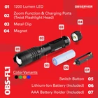 【X-Factor】This is the most feature-rich flashlight on the market (Powerful, Rechargeable, Up to 72h Runtime, Power Bank, Dual-Power, Magnet, Zoom, Waterproof). Don’t settle for just a few features when you can have it all in one LED flashlight. 【High-Power Tactical Light】1200 Lumen on High (500 Lumen on Low, 60 lumens on Ultra-Low) and 886 ft (270 m) beam distance for maximum illumination from your tactical flashlight rechargeable. Zoom capability allows you to adjust the military flashlight beam width. 【Rechargeable Flashlight】Long-lasting lithium-Ion battery delivers significant savings vs. disposable batteries. Runtime: 4-hours on High, 8-hours on Low, 72-hours on Ultra-Low (perfect for power outages and other emergencies). Charge before first use using the included USB Type-C charging cord (plug not included). 【Power Bank to Charge Your Devices】Power bank allows you to use this rechargeable flashlight as a phone charger. Unique 3-in-1 charging cord comes with Apple Lighting, micro-USB and USB Type-C connectors. 【Survival Flashlight】AAA battery holder (included) takes three AAA batteries (not included) and can replace the rechargeable battery so your rechargeable tactical flashlight always has a back-up power supply.