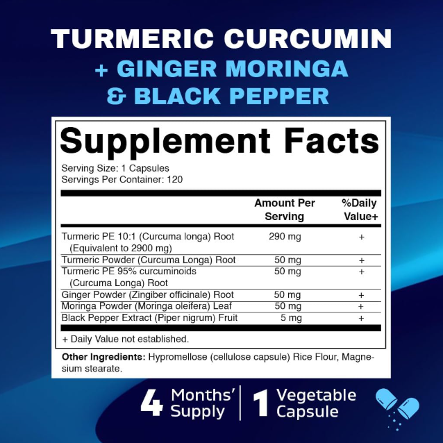 Pastillas de Curcumina de Curcuma 3000mg- Suplemento Natural de Apoyo Non-GMO 12 US Warehouse - FREE & FAST Shipping in US Product Description: These statements have not been evaluated by the FDA. This product is not intended to diagnose, treat, cure, or prevent any disease or health condition. MADE WITH 95% CURCUMINOIDS, GINGER, & MORINGA - Our premium Turmeric Curcumin Complex 3000mg Equivalent Serving; with 95% Standardized Curcuminoids, Ginger, Moringa and enhanced with Black Pepper to provide maximum absorption and bio-availability ENHANCED ABSORPTION WITH BLACK PEPPER: Black Pepper, with ginger, has been shown to improve the absorption of many herbs and spices; and provides as much as 2000x better absorption than consuming normal turmeric capsules alone Third-Party Tested: This product undergoes rigorous third-party testing to ensure quality and purity. Vegetarian Capsules: Made with vegetable cellulose, these capsules are non-GMO and gluten-free. Convenient Dosage: With 120 Capsules / 120 Servings per bottle, this supplement provides a long-lasting supply. Easy to Swallow: The capsules are designed for easy consumption and absorption. QUALITY ASSURED: Made in the USA in an FDA-inspected facility following strict GMP guidelines. Feedback: 1.Any question for your order, please contact us in time, we will reply to you within 24 hours and give you a satisfactory answer. 2.If you are satisfied with our products and services, hope to take up your a little precious time to leave feedback reviews for our products.Thanks! 3.Your satisfaction is our effort. Welcome to order again! Have a great day! Our Policy: 100% Satisfaction Guarantee 20% of restocking fee will be charged for return item