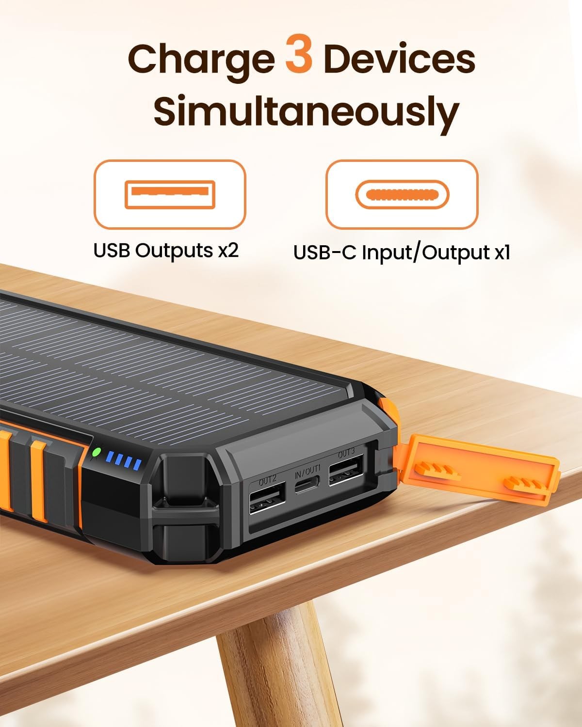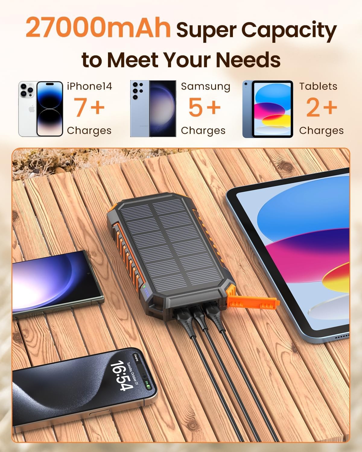 Hiluckey Power Bank 27000mAh Solar Charger, 15W USB C Fast Charging Portable Phone Charger for iPhone, Three Outputs, External Battery Pack with Bright LED Flashlight for Outdoor Camping Product Details Product Dimensions: 6.89 x 3.54 x 1.18 inches Item Weight: 1.08 pounds Item model number: T11L Batteries: 1 Lithium Polymer batteries required. Manufacturer: Dongguan Jili Intelligent Technology Co., Ltd. Brand: Hiluckey Connectivity Technology: USB Connector Type: USB Type C, USB Type A Compatible Devices: iPhone 15/15 Pro/15 Pro Max/14/14 Plus/14 Pro/14 Pro Max/13 Por Max/13 Mini/12/11/XR/XS Max; iPhone 8 Plus/8/7 Plus/7/6s Plus/6 Plus/6/SE, LG, Motorola, Nokia, One Plus, iPad and more, Samsung Galaxy S22 Ultra,S22+,S22,S21 S20 S10 S9 Plus,Samsung Galaxy S 8,Samsung Galaxy S 8 Plus,Samsung Galaxy S 7,Samsung Galaxy S 6,Samsung Galaxy S 6 Edge,Samsung Galaxy S 5 iPhone 15/15 Pro/15 Pro Max/14/14 Plus/14 Pro/14 Pro Max/13 Por Max/13 Mini/12/11/XR/XS Max; iPhone 8 Plus/8/7 Plus/7/6s Plus/6 Plus/6/SE, LG, Motorola, Nokia, One Plus, iPad and more, Samsung Galaxy S22 Ultra,S22+,S22,S21 S20 S10 S9 Plus,Samsung Galaxy S 8,Samsung Galaxy S 8 Plus,Samsung Galaxy S 7,Samsung Galaxy S 6,Samsung Galaxy S 6 Edge,Samsung Galaxy S 5iPhone 15/15 Pro/15 Pro Max/14/14 Plus/14 Pro/14 Pro Max/13 Por Max/13 Mini/12/11/XR/XS Max; iPhone 8 Plus/8/7 Plus/7/6s Plus/6 Plus/6/SE, LG, Motorola, Nokia, One Plus, iPad and more, Samsung Galaxy S22 Ultra,S22+,S22,S21 S20 S10 S9 Plus,Samsung Galaxy S 8,Samsung Galaxy S 8 Plus,Samsung Galaxy S 7,Samsung Galaxy S 6,Samsung Galaxy S 6 Edge,Samsung Galaxy S 5 See more Compatible Phone Models: iPhone 15/15 Pro/15 Pro Max/14/14 Plus/14 Pro/14 Pro Max/13 Por Max/13 Mini/12/11/XR/XS Max; iPhone 8 Plus/8/7 Plus/7/6s Plus/6 Plus/6/SE, Samsung Galaxy S22 Ultra,S22+,S22,S21 S20 S10 S9 Plus,Samsung Galaxy S 8,Samsung Galaxy S 8 Plus,Samsung Galaxy S 7,Samsung Galaxy S 6,Samsung Galaxy S 6 Edge,Samsung Galaxy S 5, LG, Motorola, Nokia, One Plus, iPad iPhone 15/15 Pro/15 Pro Max/14/14 Plus/14 Pro/14 Pro Max/13 Por Max/13 Mini/12/11/XR/XS Max; iPhone 8 Plus/8/7 Plus/7/6s Plus/6 Plus/6/SE, Samsung Galaxy S22 Ultra,S22+,S22,S21 S20 S10 S9 Plus,Samsung Galaxy S 8,Samsung Galaxy S 8 Plus,Samsung Galaxy S 7,Samsung Galaxy S 6,Samsung Galaxy S 6 Edge,Samsung Galaxy S 5, LG, Motorola, Nokia, One Plus, iPadiPhone 15/15 Pro/15 Pro Max/14/14 Plus/14 Pro/14 Pro Max/13 Por Max/13 Mini/12/11/XR/XS Max; iPhone 8 Plus/8/7 Plus/7/6s Plus/6 Plus/6/SE, Samsung Galaxy S22 Ultra,S22+,S22,S21 S20 S10 S9 Plus,Samsung Galaxy S 8,Samsung Galaxy S 8 Plus,Samsung Galaxy S 7,Samsung Galaxy S 6,Samsung Galaxy S 6 Edge,Samsung Galaxy S 5, LG, Motorola, Nokia, One Plus, iPad See more Included Components: 60 vibrant LED lights, a fast charge adapter Special Feature: Large Bright LED Flashlight, 3A Fast Charging, Short Circuit Protection, USB C Input/Output Port, Solar Charging Large Bright LED Flashlight, 3A Fast Charging, Short Circuit Protection, USB C Input/Output Port, Solar ChargingLarge Bright LED Flashlight, 3A Fast Charging, Short Circuit Protection, USB C Input/Output Port, Solar Charging See more Mounting Type: Wall Mount Amperage: 3 Amps Total USB Ports: 3 Huge Power Capacity: The solar charger boasts an impressive 27000mAh capacity, which can charge your iPhone 15 over 7 times or your Galaxy S23 more than 5 times on a single charge. Enjoy days of uninterrupted use, perfect for extended outdoor adventures or emergency situations. Three Outputs & Fast Charging: Featuring 1 USB C in/out port and 2 USB A output ports, keep all your devices powered up on the go with our solar power bank's ability to charge up to three devices simultaneously. With 3A rapid charging, the solar battery pack can juice up your iPhone 15 to 55% in just 30 minutes. Enjoy the convenience of fast and efficient charging on the go. Illuminate Your Adventure: Enhance your outdoor experience with the built-in 60 vibrant LED lights. Whether you're hiking at night or camping, switch between different modes to get the perfect illumination every time. Trust our portable charger to light up your path and ensure your safety during any adventure. Dual Charging Methods: Versatility at its best – our power bank can be fully recharged in 8 hours using a fast charge adapter or harness the power of the sun for emergency charging. No matter where you are, you can always keep your devices powered and ready to go. Rugged Outdoor Essential: Crafted from highly durable materials, this solar power bank is built to withstand drops, dust, and moisture. It's the ideal robust power source for outdoor enthusiasts, ensuring reliability and durability in even the harshest conditions. Make it your go-to companion for all your outdoor expeditions.