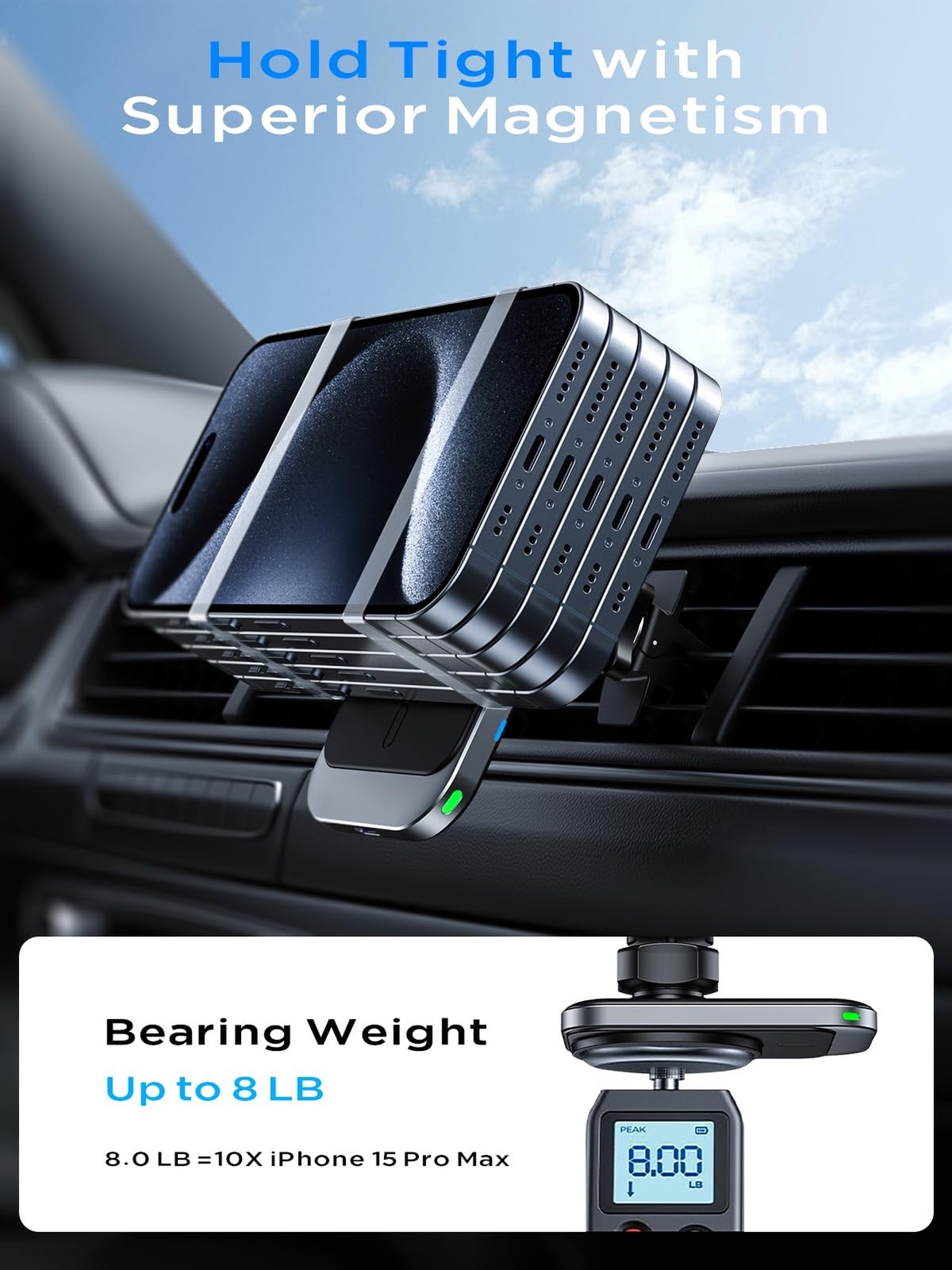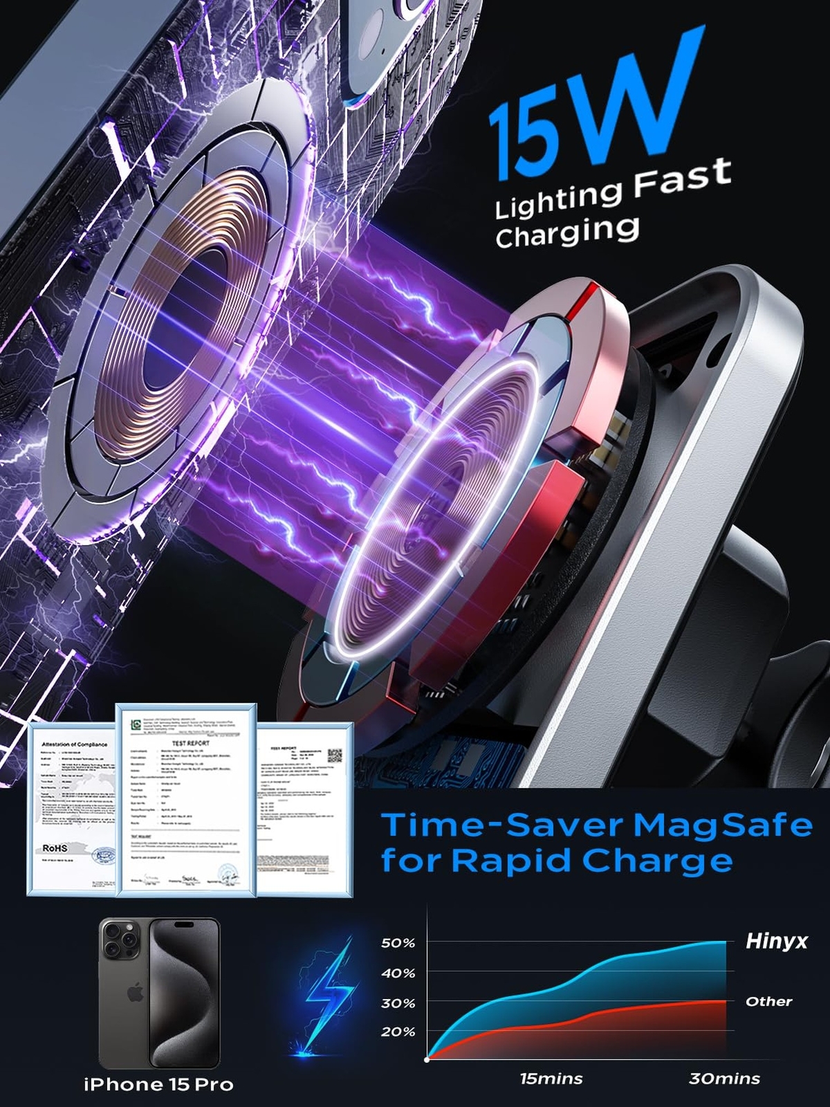 Hinyx for MagSafe Car Mount Charger, 15W Magnetic Wireless Car Charger Vent Dash Charging Phone Holder Mount for iPhone 15 14 13 12 11 Pro Max Plus Mini Xr Xs, Samsung, Google, LG, etc - Buy Now with Fast Shipping! Hinyx for MagSafe Car Mount Charger, 15W Magnetic Wireless Car Charger Vent Dash Charging Phone Holder Mount for iPhone 15 14 13 12 11 Pro Max Plus Mini Xr Xs, Samsung, Google, LG, etc Product Details Connector Type: USB Type C Compatible Devices: iPhone 15/14/13/12 Series Compatible Phone Models: Google Pixel,Iphone,S21 Included Components: Magnetic car mount charger, air vent clip, nano-gel suction cups, and user manual Special Feature: Magnetic Color: Black Input Voltage: 9 Volts Amperage: 2 Amps Total USB Ports: 1 Wattage: 15 watts Product Dimensions: 5.12 x 1.18 x 3.15 inches Item Weight: 8.8 ounces Item model number: CW19 Connectivity technologies: Wireless Special features: Magnetic Other display features: Wireless Color: Black Whats in the box: Magnetic car mount charger, air vent clip, nano-gel suction cups, and user manual Manufacturer: Shenzhen Meskey Technology co.,ltd Country of Origin: China Date First Available: December 24, 2021 Key Features ✅ 15W Fast Charging, Superior SafetyEquipped with an upgraded smart chip, the magsafe car charger offers up to 15W of rapid charging, juicing up your phone by 60% in just 30mins. Saving 50mins in full charging time than other car chargers, without having to wait for an extended period. Certified by FCC, UL, and CE, our wireless car charger integrates multiple safety protections against over-current, overheating, short-circuits, etc. over 5 years or 4000+ charging cycles. ✅ Powerful Magnetic ForceBuilt-in 14 powerful N52 temperature-resistant magnets, our magsafe car holder boasts a 2500g ultra-strong magnetic grip, 1:1 compatible with MagSafe for faster charging. Whether on high speeds, bumpy roads, or winding paths, it can firmly hold your phone without any fall. Even in the hot summer, the magnetism remains powerful. The enclosed magnetic field technique neither disrupts signals nor compromises battery health. ✅ Universal CompatibilityThe magsafe car mount is not only charging for iPhone 15/14/13/12, 15/14/13/12 Pro, 15/14/13/12 Pro Max, 15/14 Plus, 13/12 Mini(directly charging) but also charging for all wireless phones (install magnet ring), like iPhone 11/11 Pro/Xr/ Xs/X/8, SAMSUNG S23/S22/S21 /S20/Note 20/Note 10, Google Pixel, ONEPLUS, LG, etc. Compatible with magsafe/magnetic cases, avoid phone cases with embedded metals, grips, coins, credit cards, or other metallic objects. ✅ Strong Suction Base, Easy to InstallThis magnetic car charger can be installed on the car air vent, dashboard, windshield, or desk. Installed in just 15 seconds. Upgraded three-layer nano-gel suction cups form a strong vacuum double lock with one click, and up to 77 pounds of suction force firmly grips the dashboard. Stable air vent clip fit for horizontal and vertical vents. Available for all car models. ✅ Extra Features, 60-Month WarrantyEasily answer calls or switch to landscape navigation with one hand, making driving safer. 360-degree rotation ensures viewing your phone from any angle, achieving the best view. Doesn't obstruct the air vent, ensuring smooth airflow inside the car. The LED indicator light allows for quick phone location in the dark. Benefit from our 60-month worry-free refund or replacement guarantee. Our 24/7 support responds within 12 hours. Product Description